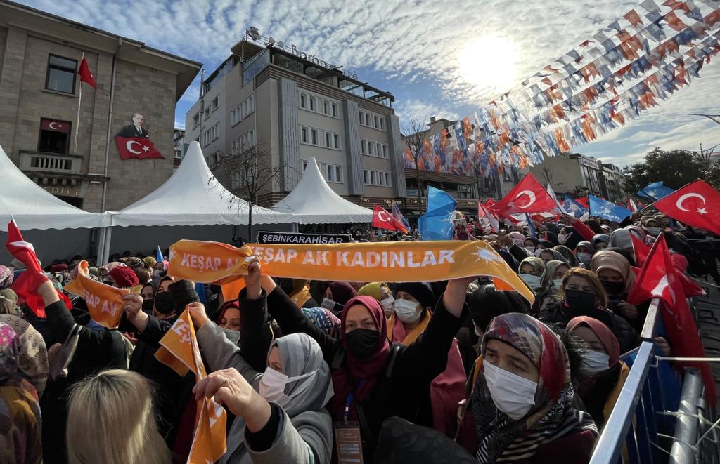 2002 yılında ülkeyi yönetme sorumluluğunu üstlendiklerinde millete, "Türkiye'yi 4 temel taş üzerinde, eğitim, sağlık, adalet, emniyet bunların üzerinde yükselteceğiz." dediklerini anımsatan Cumhurbaşkanı Erdoğan, "Bunlar yetmez başka, 'ulaşım' dedik, 'enerji' dedik, 'tarım' dedik, 'dış politika' dedik. Bütün bunlar üzerinde yükselen bir Türkiye'yi inşa ettik. İşte ben şimdi görüyorum ki Giresun bizden aldığı bu enerji ile şu anda karşımdaki topluluğa bakıyorum aynı sinerji burada da var. Zira demek ki birbirimize aşığız. Aşk, öyle bir şeydir ki kişinin sevdiğinde yok olmasıdır. Biz sizi seviyoruz ve sizde yok oluyoruz." diye konuştu.