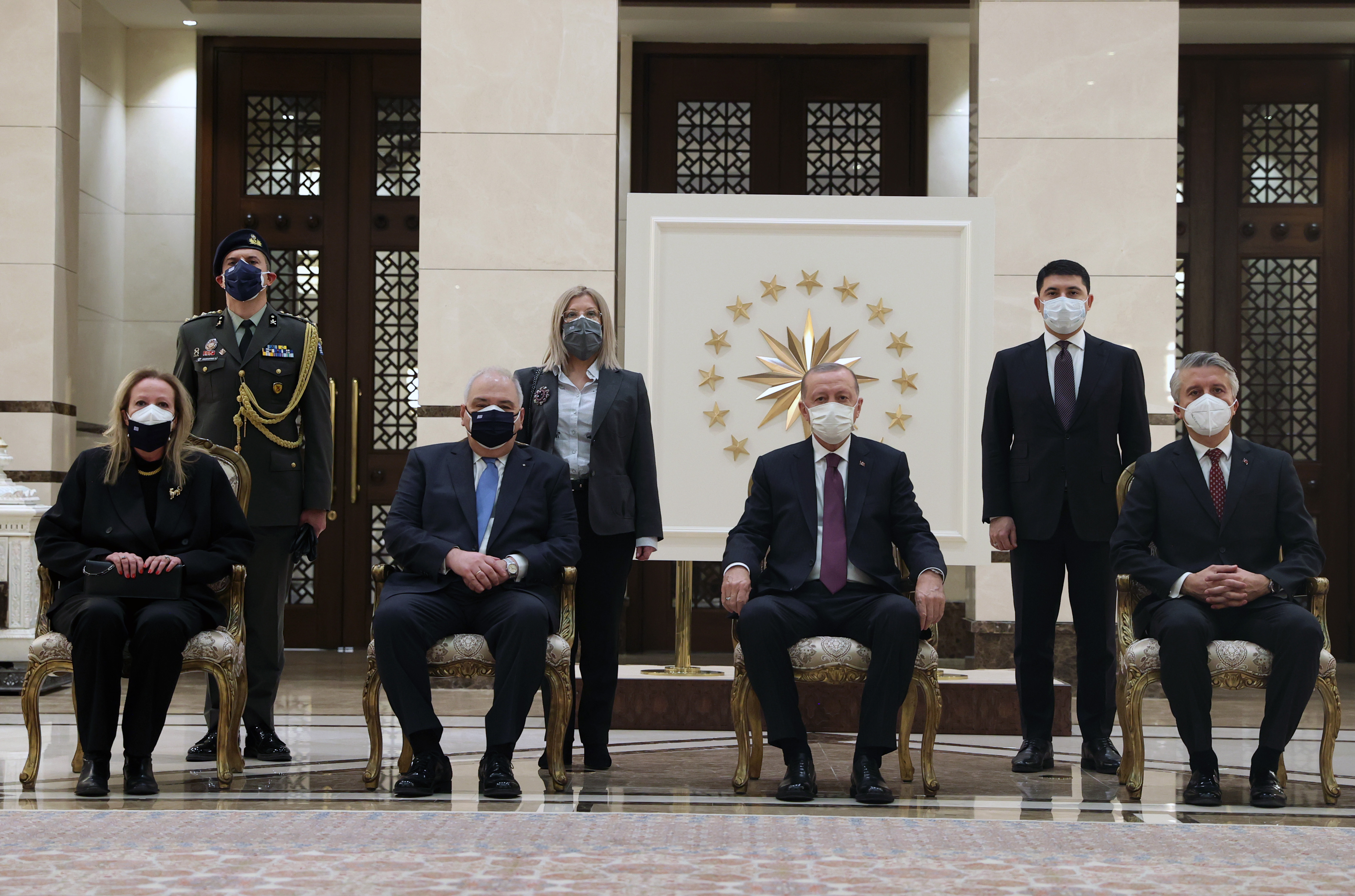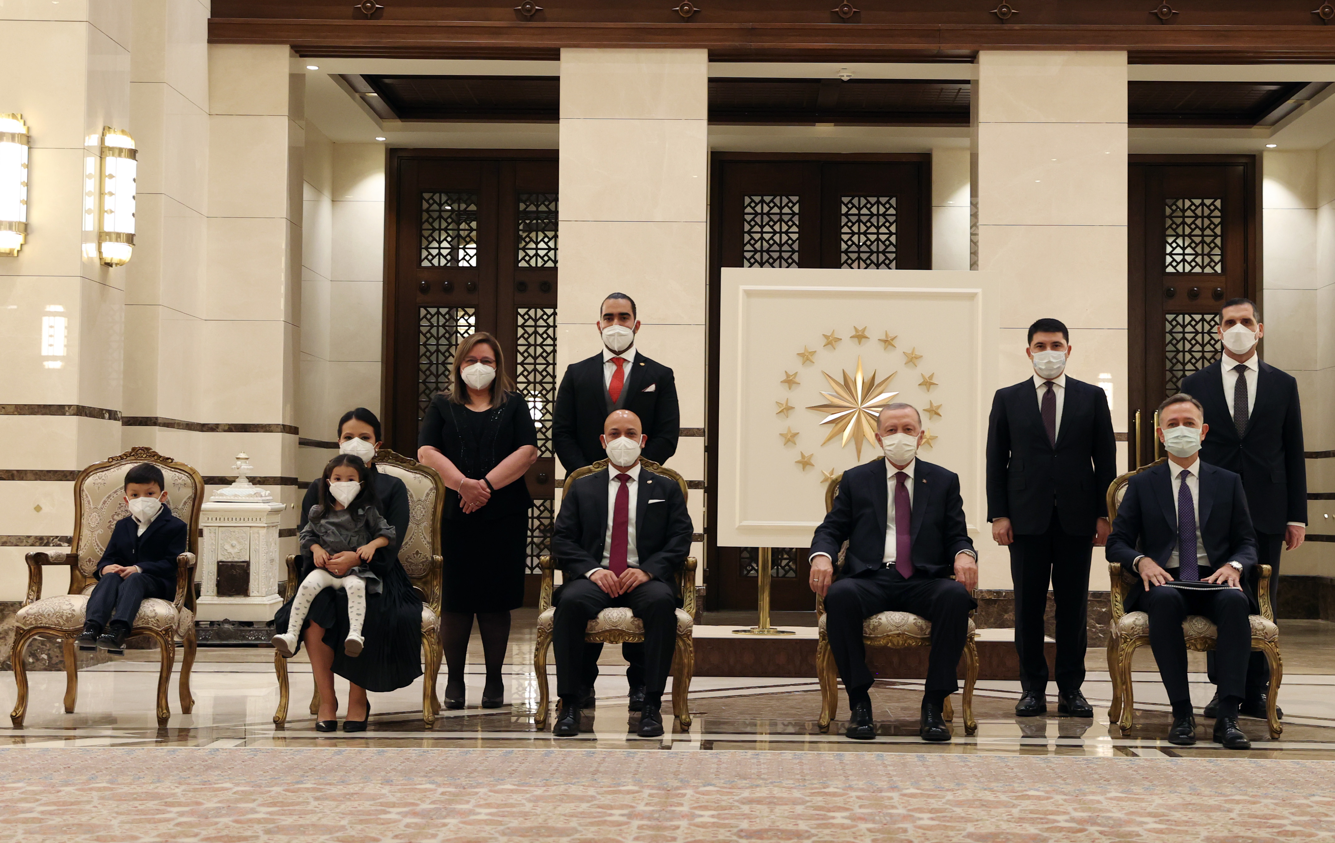 Büyükelçilerin eşleri ve çocukları ile bazı büyükelçilik mensuplarının Cumhurbaşkanı Erdoğan'a takdiminin ardından hatıra fotoğrafı çektirildi.
