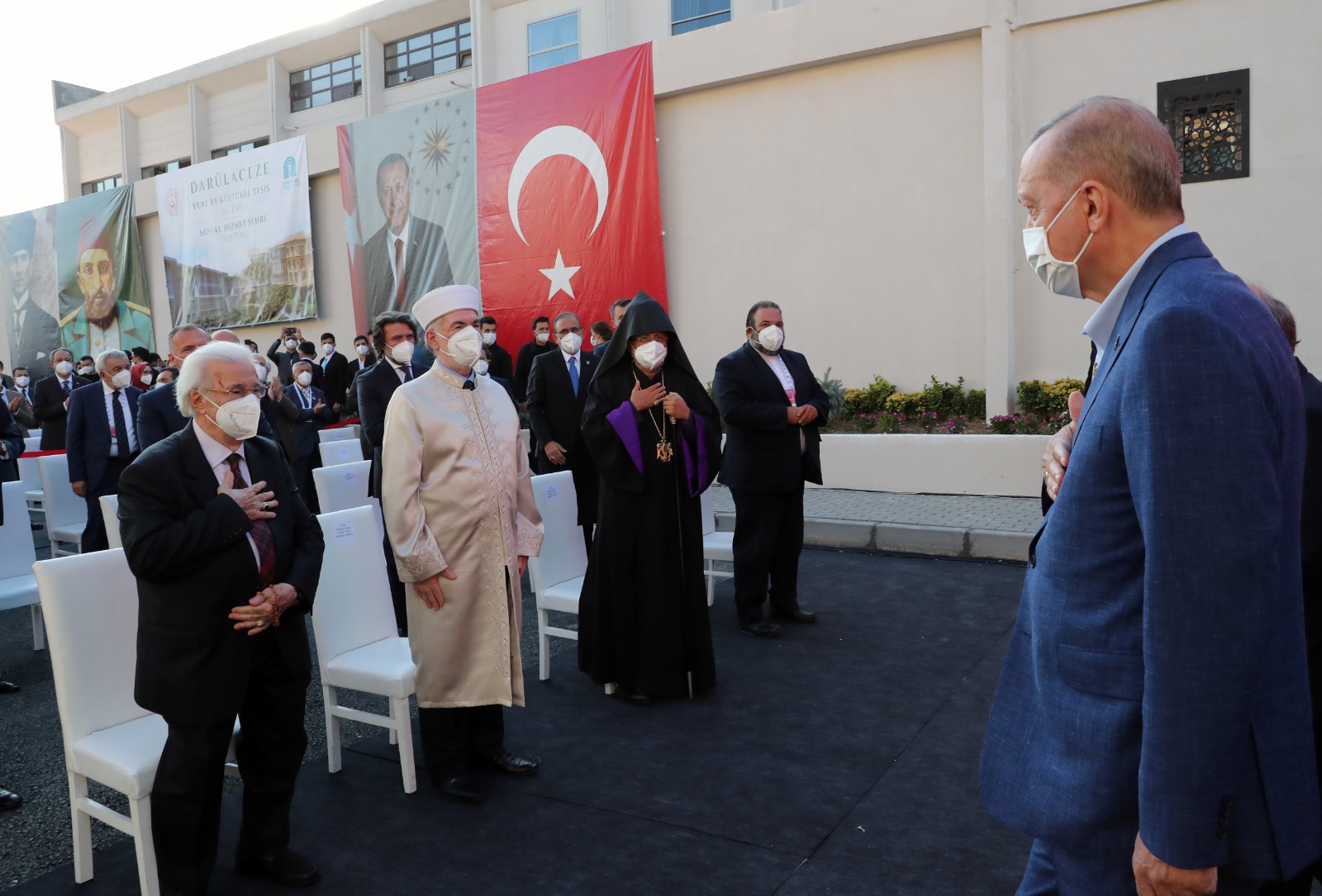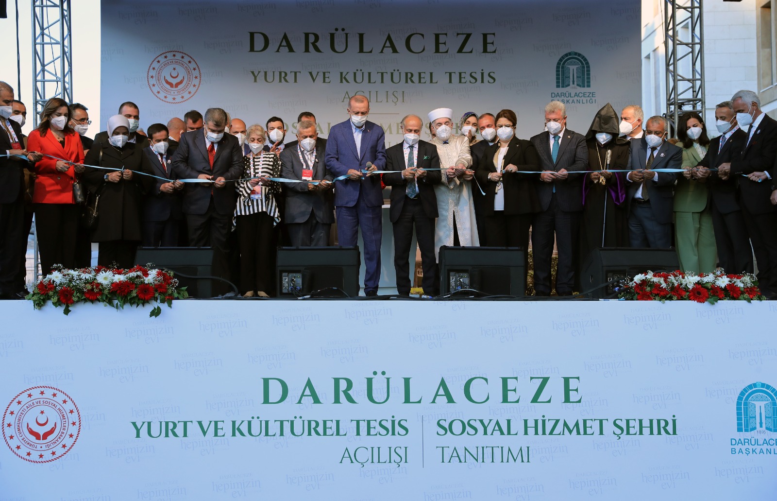 Cumhurbaşkanı Erdoğan'a Darülaceze sakinleri Ali Karcı ve Pervin Ersöz tarafından hediye takdim edildi. Yapımı tamamlanan tesislerin açılışı dolayısıyla Cumhurbaşkanı Erdoğan, bakanlar ve katılımcılar kurdele kesti.