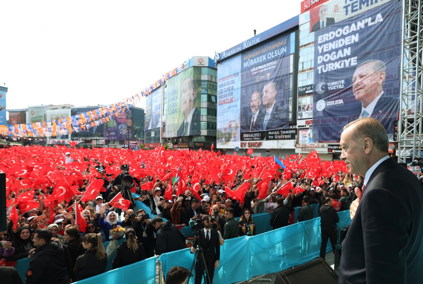 Dik duruşları sebebiyle hep mücadeleleri kazandıklarını, sayısız tuzağı bozduklarını, yine bu sayede ülkeye asırlık demokrasi ve kalkınma kazanımları sağladıklarını vurgulayan Cumhurbaşkanı Erdoğan, "Biraz daha sabır ve 14 Mayıs'ta çok daha güçlü bir destek istiyorum. Buna var mıyız? Bu ülkenin ve insanlarının demokrasiden kalkınmaya tüm meselelerini nasıl biz çözdüysek, bugünkü sıkıntıların üstesinden gelecek olan da yine biziz." dedi.