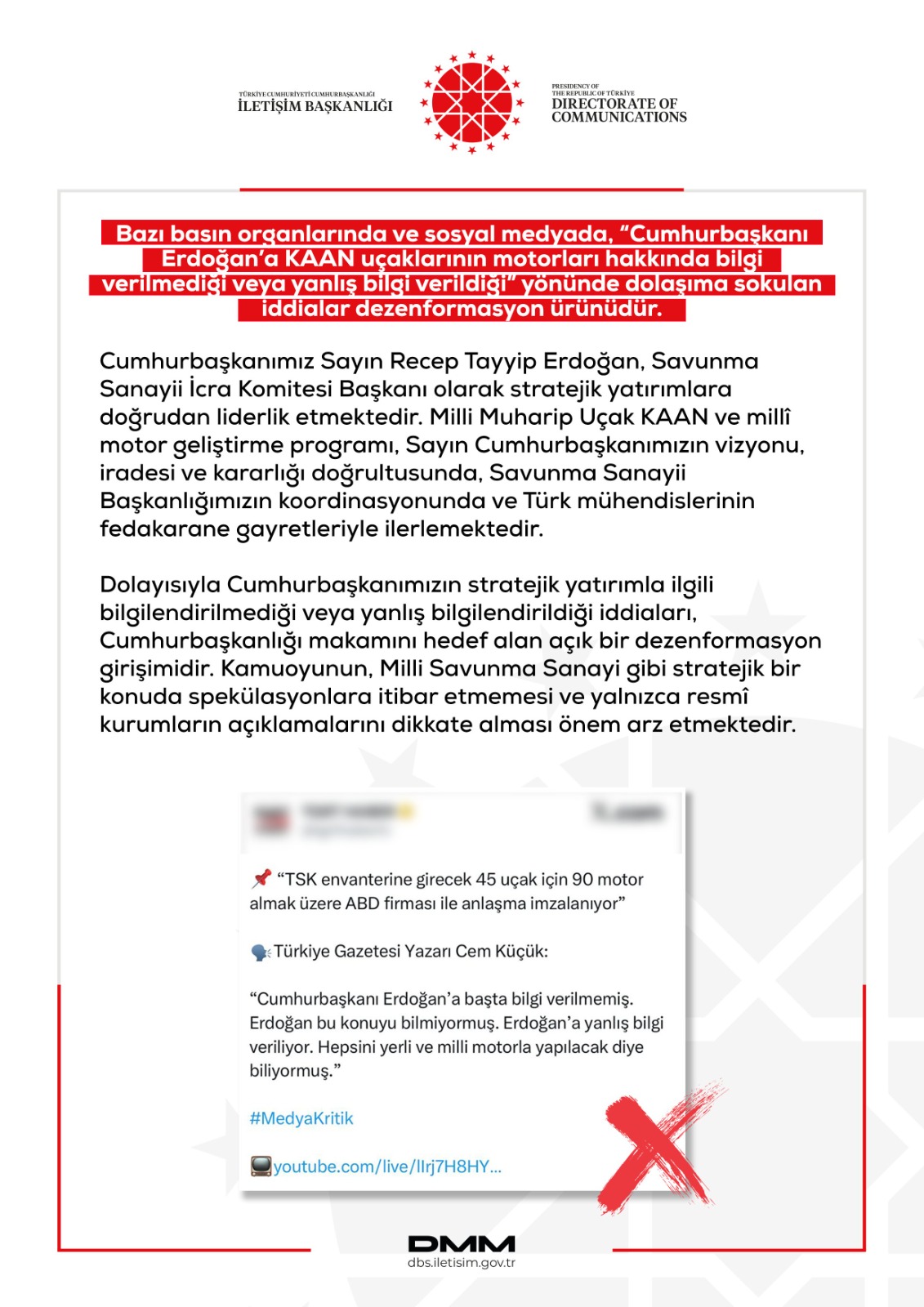 Bazı basın organlarında ve sosyal medyada, “Cumhurbaşkanı Recep Tayyip Erdoğan’a KAAN uçaklarının motorları hakkında bilgi verilmediği veya yanlış bilgi verildiği” yönünde dolaşıma sokulan iddialar dezenformasyon ürünüdür.