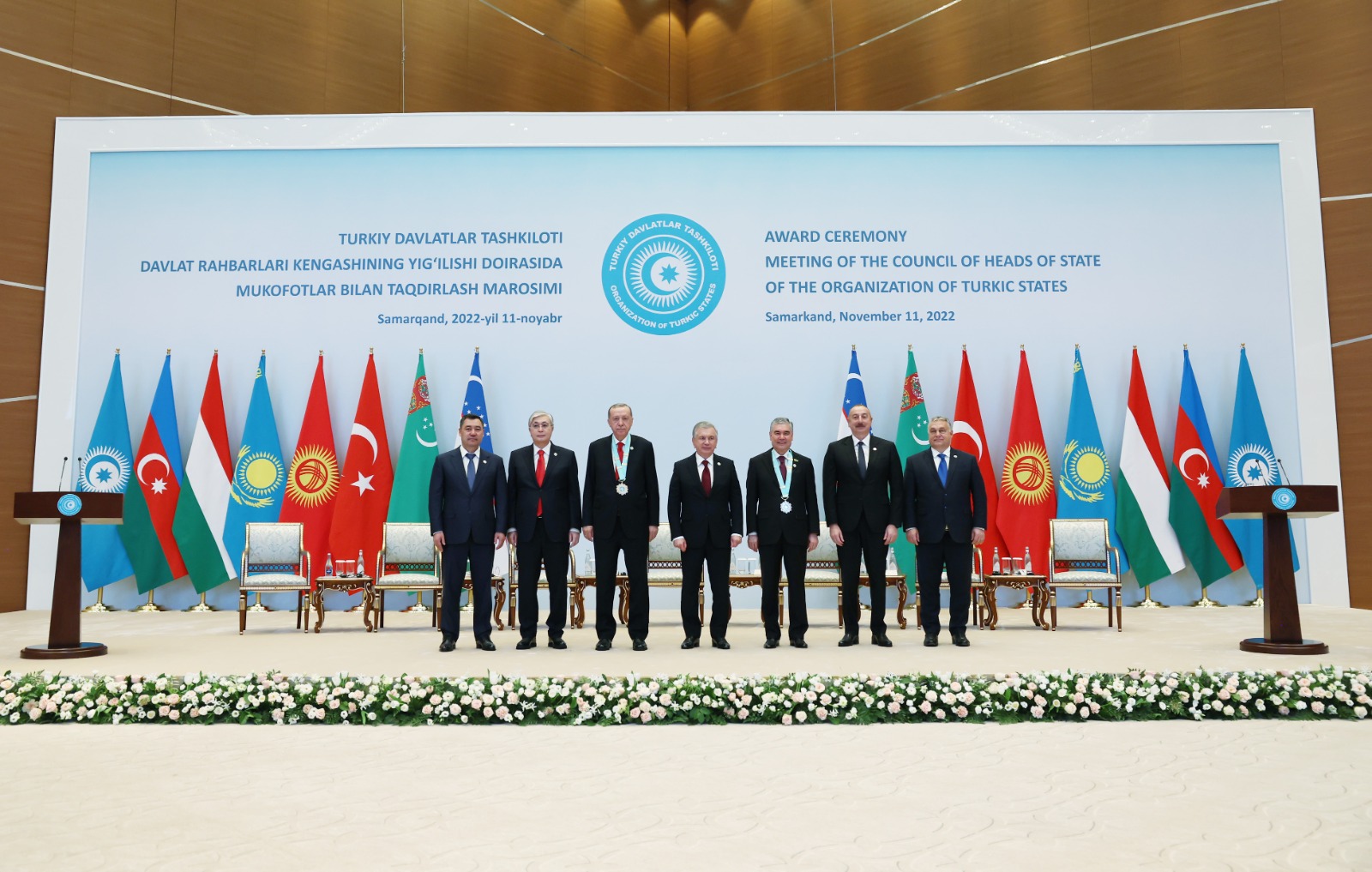 Özbekistan Cumhurbaşkanı Mirziyoyev, "Türk Devletleri Teşkilatı'nda önemli rolünüz oldu. Türk devletlerinin stratejik işbirliğine, Türk halklarının işbirliğine, Türk devletlerinin faaliyetlerine önemli katkılarınız oldu. Bu katkılarınız ve gayretleriniz nedeniyle Türk Devletleri Teşkilatı olarak size Türk Dünyası Ali Nişanı'nı tevcih ediyoruz." dedi.