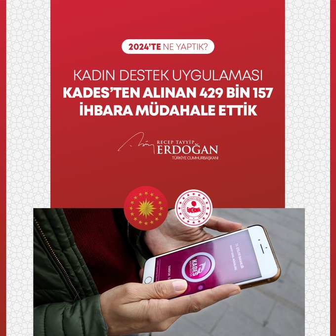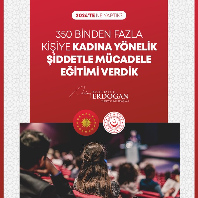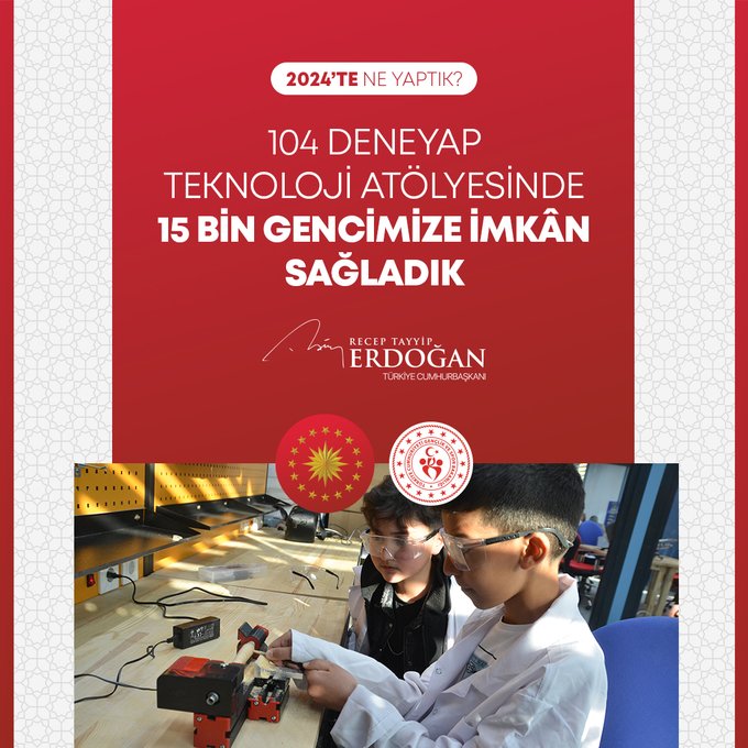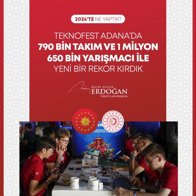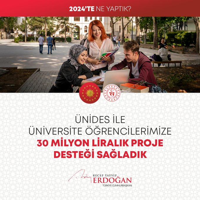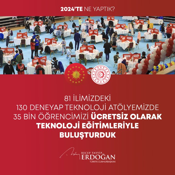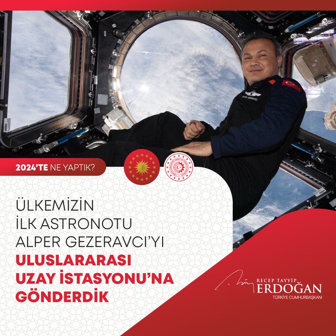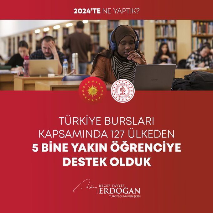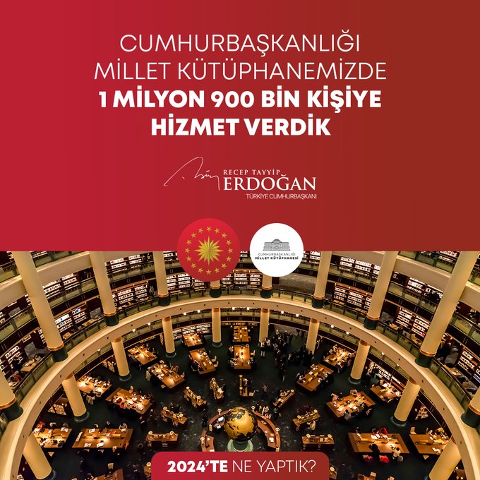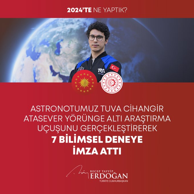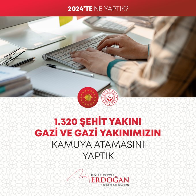 "Bin 320 şehit yakını, gazi ve gazi yakınımızın kamuya atamasını gerçekleştirdik. Fahiş fiyat artışlarıyla mücadelede 613 binin üzerinde ürün denetledik, 785 firmaya 216 milyon liradan fazla para cezası verdik. 2024-2028 yıllarını kapsayan Kadının Güçlenmesi Strateji Belgesi ve Eylem Planı'nı hayata geçirdik. ÜNİDES Programımız ile üniversite öğrencilerimize toplamda 30 milyon liralık proje desteği sağladık. Gençlerimizin Cumhurbaşkanlığı Millet Kütüphanemize yoğun ilgisi 2024 yılında da devam etti. Kütüphanemiz, yıl boyunca 1 milyon 900 bin ziyaretçiyle yeni bir rekor kırdı. Türkiye Bursları ile 127 ülkeden 5 bine yakın öğrenciye destek olduk. Uzay çalışmalarında yeni bir dönemin kapılarını araladık. Millî Uzay Programımız kapsamında ilk Türk astronot Alper Gezeravcı'yı Uluslararası Uzay İstasyonu'na gönderdik."