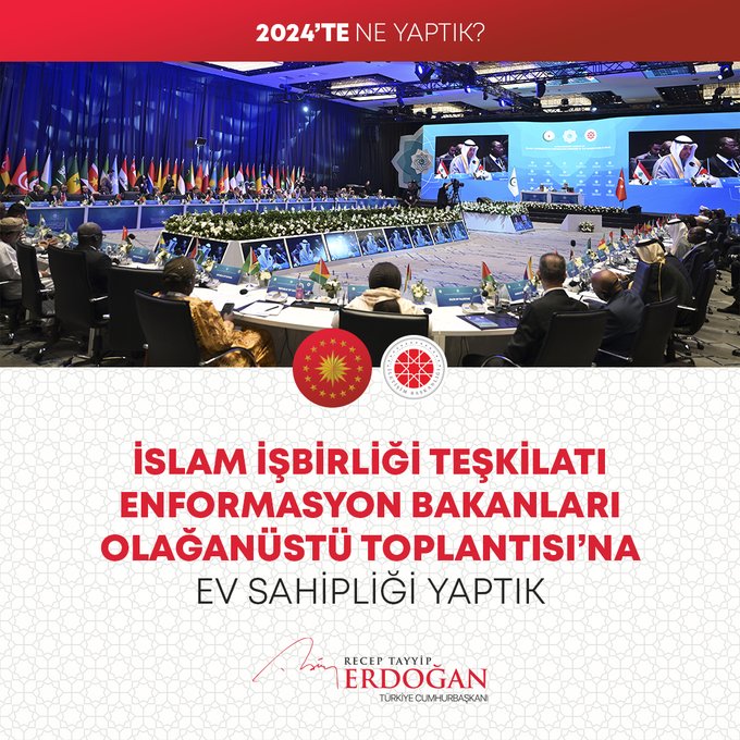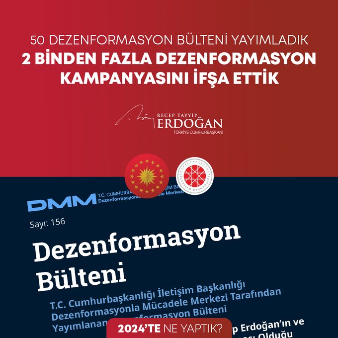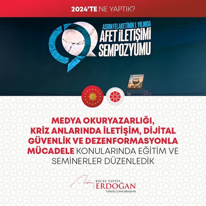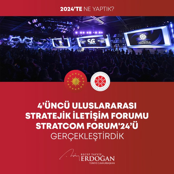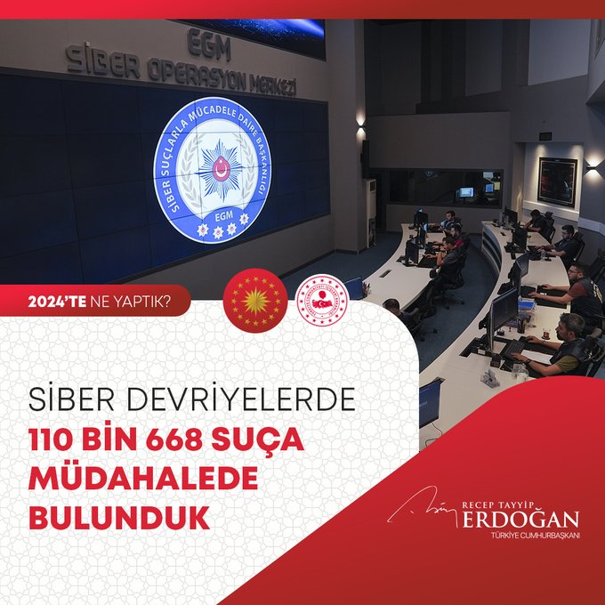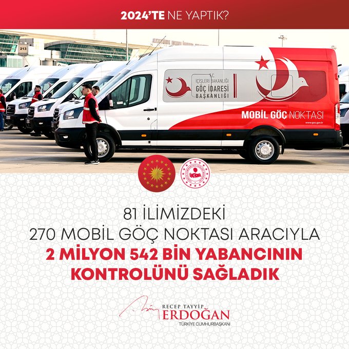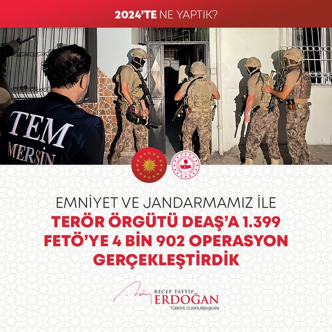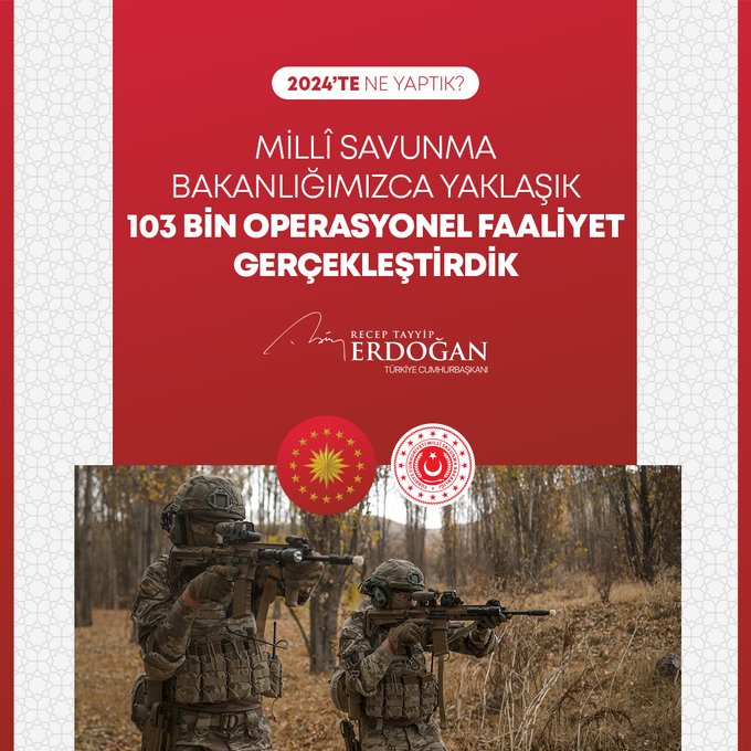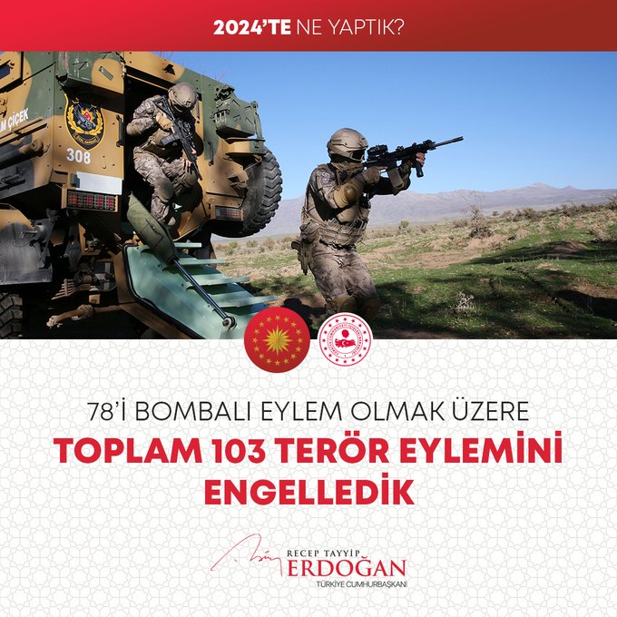 "7 binin üzerinde operasyonla göçmen kaçakçılığı yapan 12 bin 395 organizatörü yakaladık. Pirireis denizaltımızı hizmete aldık, Hızırreis denizaltımızın seyir testlerini başlattık. Yapımı devam eden tüm denizaltılarımızı inşallah 2029 yılına kadar hizmete alacağız. Uluslararası öneme sahip toplantılarda ülkemizin kamu diplomasisi vizyonunun küresel boyutta tanınması ve güçlendirilmesi adına önemli iletişim faaliyetleri gerçekleştirdik. Seyahatsever Genç Projemizi 2024 yılında da sürdürdük. 133 bin gencimizi yurtlarımızda ücretsiz şekilde ağırladık. The Lies of Israel platformu ile 7 dilde yayın yaptık, soykırım politikasını meşrulaştıran yalan kampanyalarına karşı Filistinli kardeşlerimizin haklı davasına destek olduk."