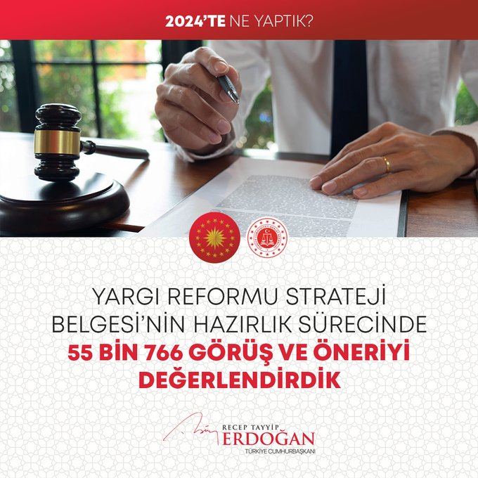 Cumhurbaşkanı Erdoğan, Yargı Reformu Strateji Belgesi'nin hazırlık sürecinde toplumun tüm kesimlerine kulak vererek, 55 binin üzerinde görüş ve öneriyi değerlendirdiklerini belirterek, şu bilgileri verdi: