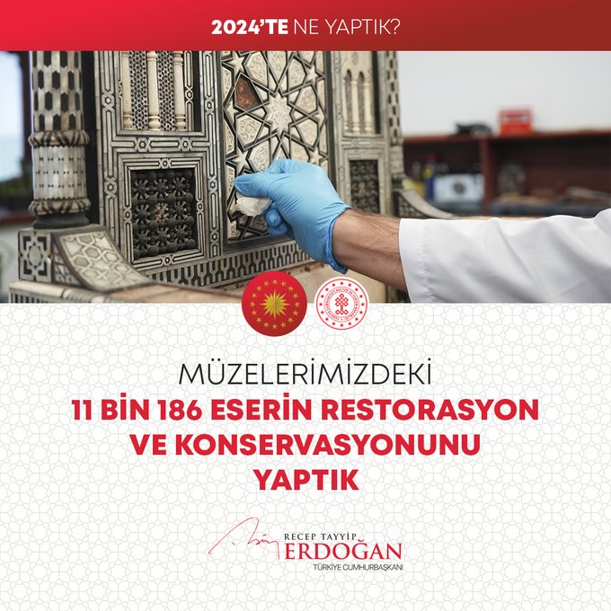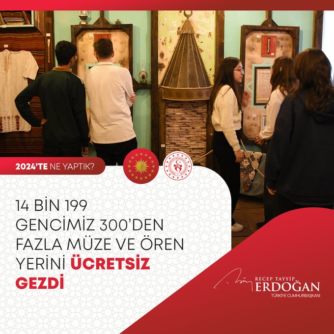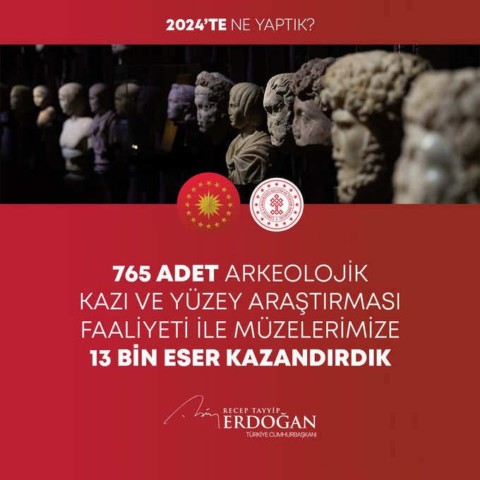 "Bugüne kadar yasa dışı yollarla ülkemizden kaçırılan on binlerce tarihî eseri ait olduğu topraklara geri getirdik. 2024 yılında da 1149 kültür varlığımızın ülkemize iadesini sağladık. 77 bin şehit yakınımız ile gazimizi evlerinde ziyaret ettik; sıkıntılarını dinledik, çözüm yolları ürettik. Türkiye genelindeki gençlik ve spor tesisi sayısını 4 bin 447'ye ulaştırdık. Kamu Eliyle Yapılan Kültür Yatırımlarına Destek Projesi kapsamında 31 projeye 568 milyon lira destek sağladık. 2,8 milyar liralık kaynak kullanarak 127 bin yaşlı vatandaşımızın ihtiyaçlarını karşıladık. Dolandırıcılık faaliyeti yürüten 60 binin üzerindeki internet sitesini tespit ederek gereken önlemleri aldık. Yılın ilk 3 çeyreğinde yüzde 3,2 büyüme kaydettik."