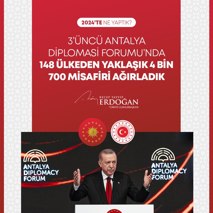 Cumhurbaşkanı Erdoğan, siber devriyeler eliyle 110 binin üzerinde suçun tespit edilerek müdahalede bulunulduğu belirterek, 148 ülkeden gelen misafirlerin ağırlandığı, teması Krizler Döneminde Diplomasiyi Öne Çıkarmak olarak belirlenen 3'üncü Antalya Diplomasi Forumu'nun da başarıyla icra edildiğini kaydetti.