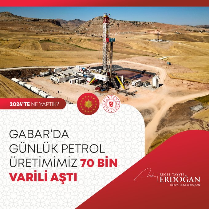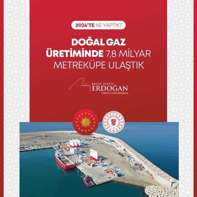 Cumhurbaşkanı Erdoğan, "Karadeniz'deki Sakarya Gaz Sahamızda 6,8 milyon metreküp ile günlük üretim rekoru kırdık; toplam doğal gaz üretimimizde 7,8 milyon metreküpe ulaştık." bilgisini paylaştı.