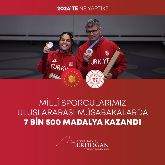Cumhurbaşkanı Erdoğan, millî sporcuların emek ve gayretlerinin milletçe herkesi gururlandırdığını, uluslararası müsabakalarda toplam 7 bin 500 madalya kazandıklarını bildirdi.