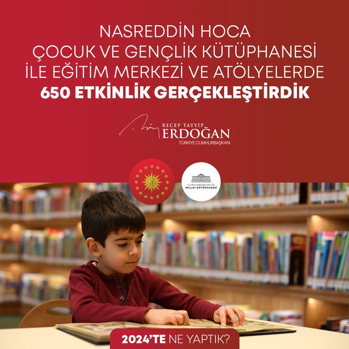"Cumhurbaşkanlığı Millet Kütüphanemizde 10 ayrı sergi düzenledik. Halk kütüphanelerimizdeki kitap sayısında 25 milyona, üye sayısında 6,5 milyona ulaştık. Bu kütüphanelerimizde 28 bine yakın etkinliğe imza attık. KOSGEB eliyle 57 bin işletmeye 13,2 milyar lira destek ödemesi yaptık. Sağlık bilimi ve teknolojileri alanındaki 437 projeye toplam 407 milyon lira destek sağladık. Petrol üretiminde günlük 126 bin varili aştık, tarihimizin en yüksek seviyesine çıktık. Ülkemizin zengin yer altı ve yer üstü kaynaklarını mutlaka değerlendireceğiz. Faizsiz ve 2 yıl geri ödemesiz kredi desteği gibi avantajların yer aldığı Evlenecek Gençlerin Desteklenmesi Projemizi başlattık. İstanbul Haliç Yat Limanı ve Kompleksi kapsamında Rixos Tersane İstanbul Oteli'nin açılışını yaptık."