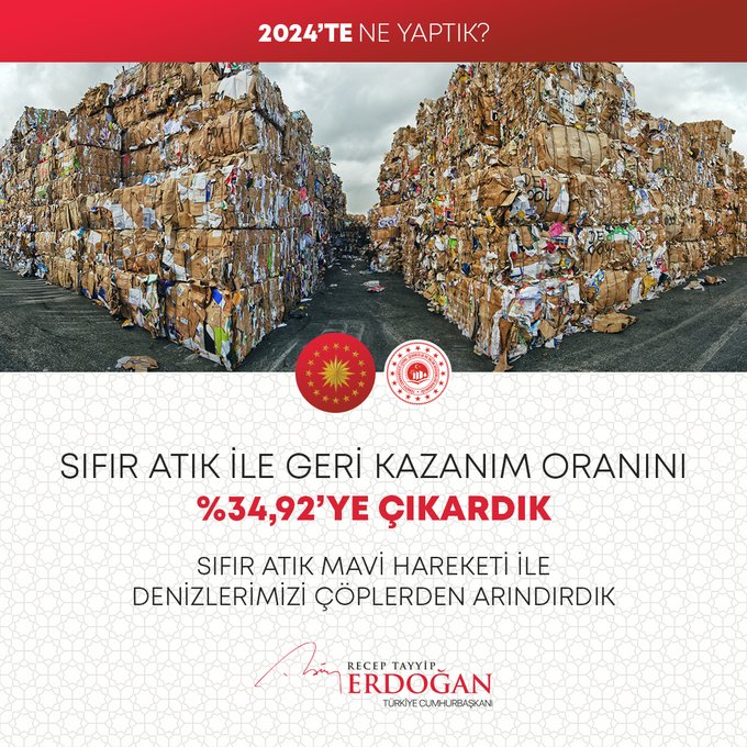 Cumhurbaşkanı Erdoğan, kamu görevlilerine, medya mensuplarına ve öğrencilere yönelik medya okuryazarlığı, kriz anlarında iletişim, dijital güvenlik ve dezenformasyonla mücadele konularında eğitim ile seminerler düzenlediğine dikkati çekerek, sıfır atıkla geri kazanım oranını yüzde 34,92'ye çıkardıklarını, Sıfır Atık Mavi Hareketi ve Deniz Çöpleri İl Eylem Planları'nı uygulayıp, toplanılan deniz çöpünü yaklaşık 245 tona ulaştırdıklarını ifade etti.