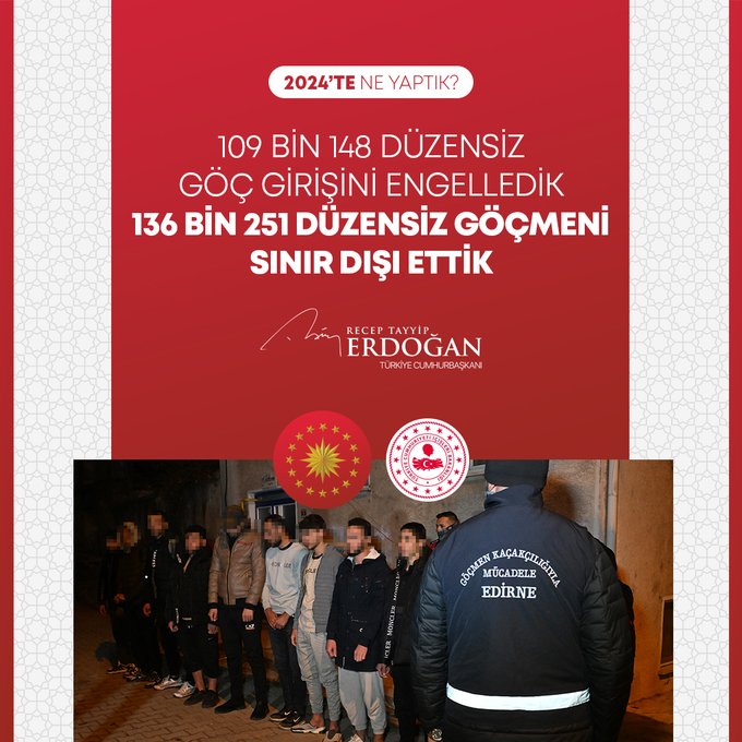 "Türk Silahlı Kuvvetlerimizin operasyonlarıyla 95 bin 503 düzensiz göçmenin geçişine engel olduk" ifadelerini kullanan Cumhurbaşkanı Erdoğan, paylaşımında yer verdiği görselde 13 bin 867 düzensiz göçmeni yakaladıklarını bildirdi.