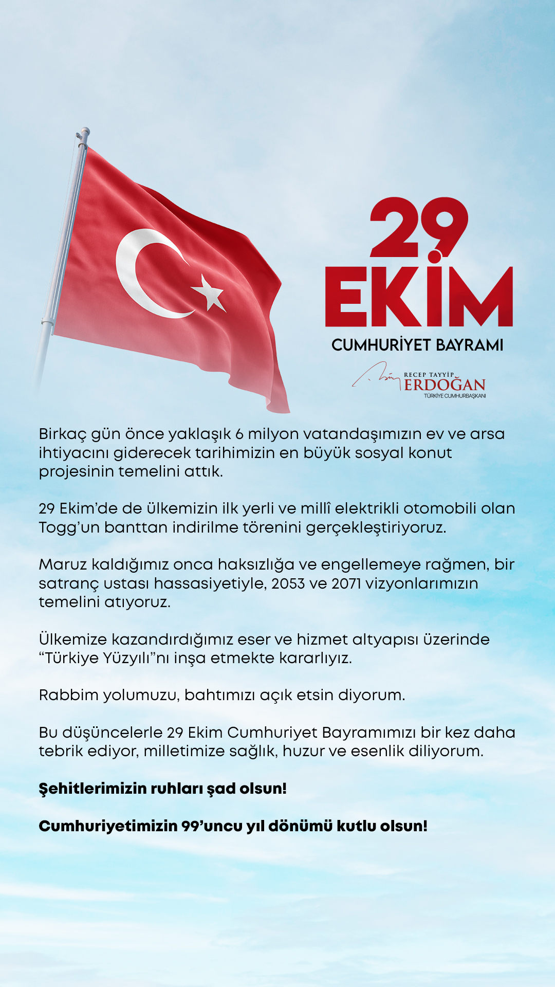 29 Ekim Cumhuriyet Bayramı'nı tebrik eden, millete sağlık, huzur ve esenlik dileyen Cumhurbaşkanı Erdoğan, "Şehitlerimizin ruhları şad olsun. Cumhuriyet'imizin 99'uncu yıl dönümü kutlu olsun." ifadesini kullandı.