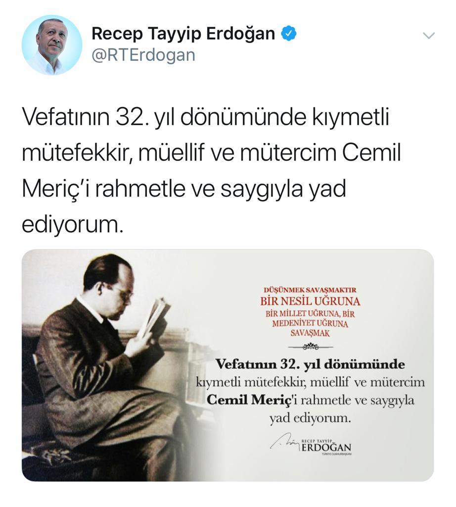 Paylaşımda, Cemil Meriç'in fotoğrafı ve "Düşünmek savaşmaktır. Bir nesil uğruna, bir millet uğruna, bir medeniyet uğruna savaşmak." ifadeleriyle Cumhurbaşkanı Erdoğan'ın "Vefatının 32. yıl dönümünde kıymetli mütefekkir, müellif ve mütercim Cemil Meriç'i rahmetle ve saygıyla yad ediyorum." ifadesi yer aldı.
