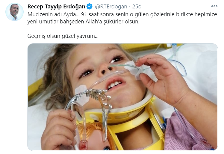 Cumhurbaşkanı Recep Tayyip Erdoğan, İzmir'deki depremin ardından 91 saat sonra Bayraklı ilçesindeki Rıza Bey Apartmanı enkazından sağ çıkarılan 4 yaşındaki Ayda Gezgin için bir mesaj paylaştı.