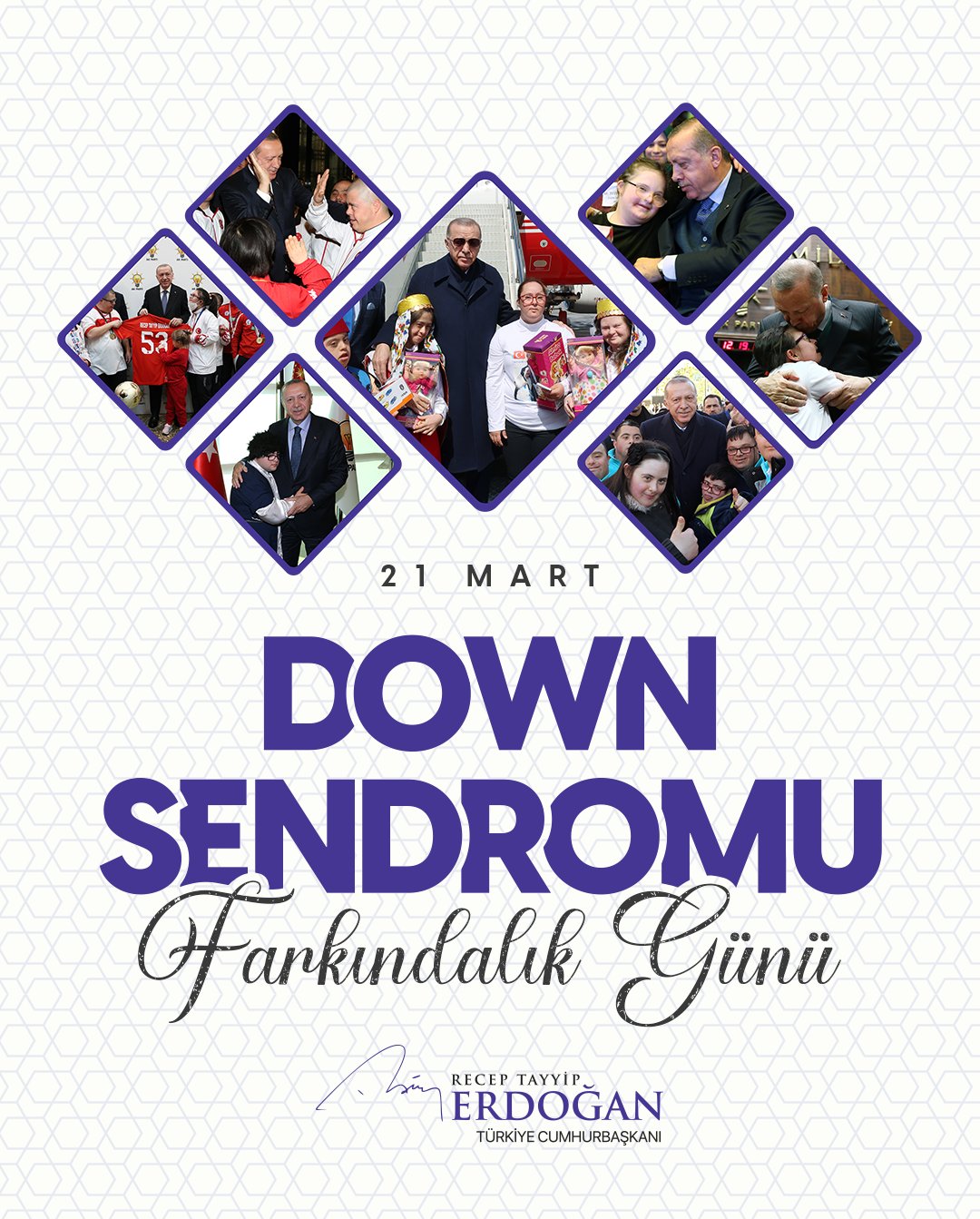 Cumhurbaşkanı Erdoğan, paylaşımda, "21 Mart Dünya Down Sendromu Farkındalık Günü vesilesiyle, dünyamızı güzelleştiren özel gereksinimli yavrularımızı gözlerinden öpüyor, değerli ailelerine, fedakâr anne ve babalarına selamlarımı iletiyorum. İyi ki varsınız..." ifadesini kullandı.