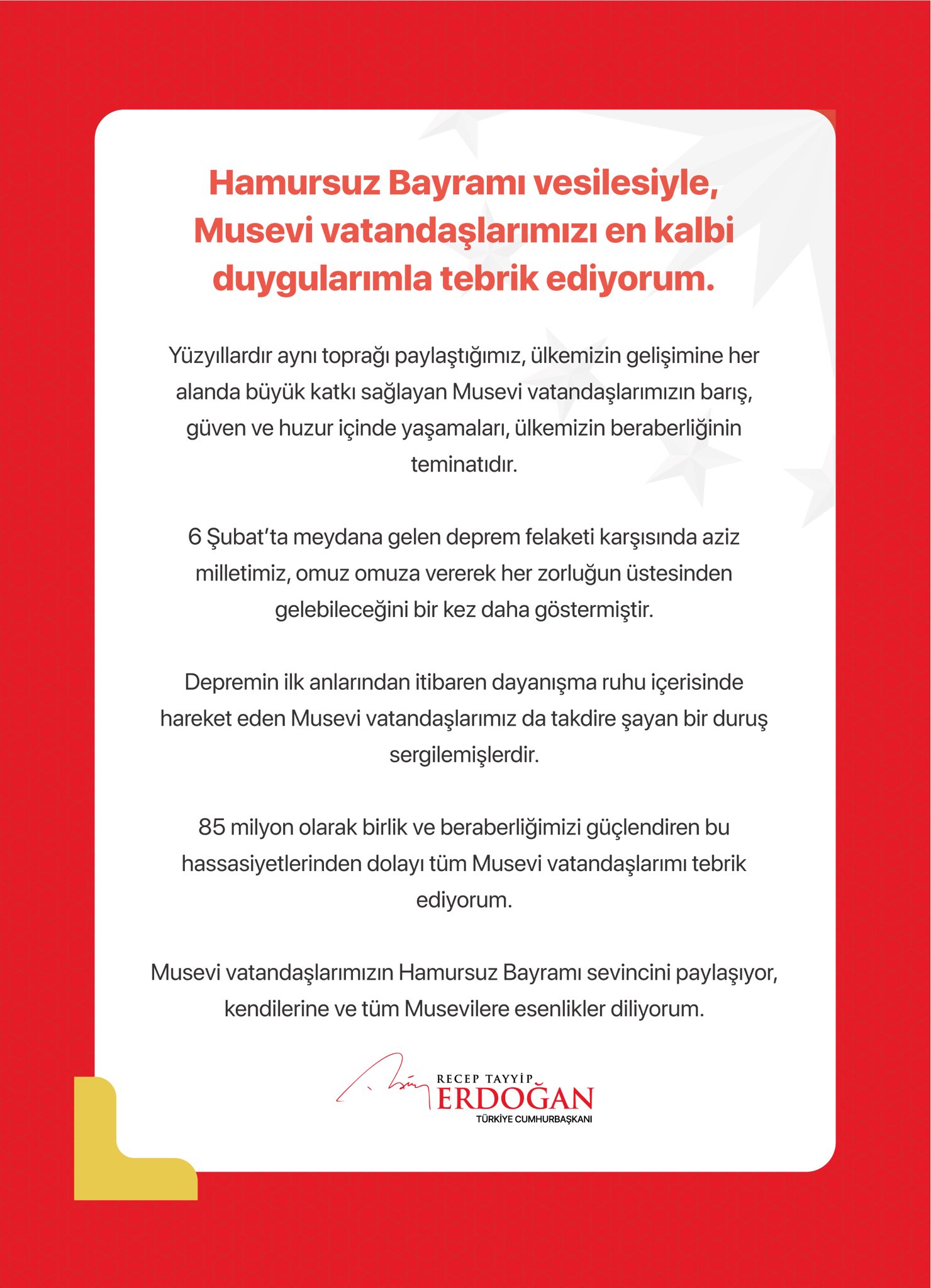 6 Şubat'ta meydana gelen deprem felaketi karşısında aziz milletimiz omuz omuza vererek her zorluğun üstesinden gelebileceğini bir kez daha göstermiştir. Depremin ilk anlarından itibaren dayanışma ruhu içerisinde hareket eden Musevi vatandaşlarımız da takdire şayan bir duruş sergilemişlerdir. 85 milyon olarak birlik ve beraberliğimizi güçlendiren bu hassasiyetlerinden dolayı tüm Musevi vatandaşlarımı tebrik ediyorum.