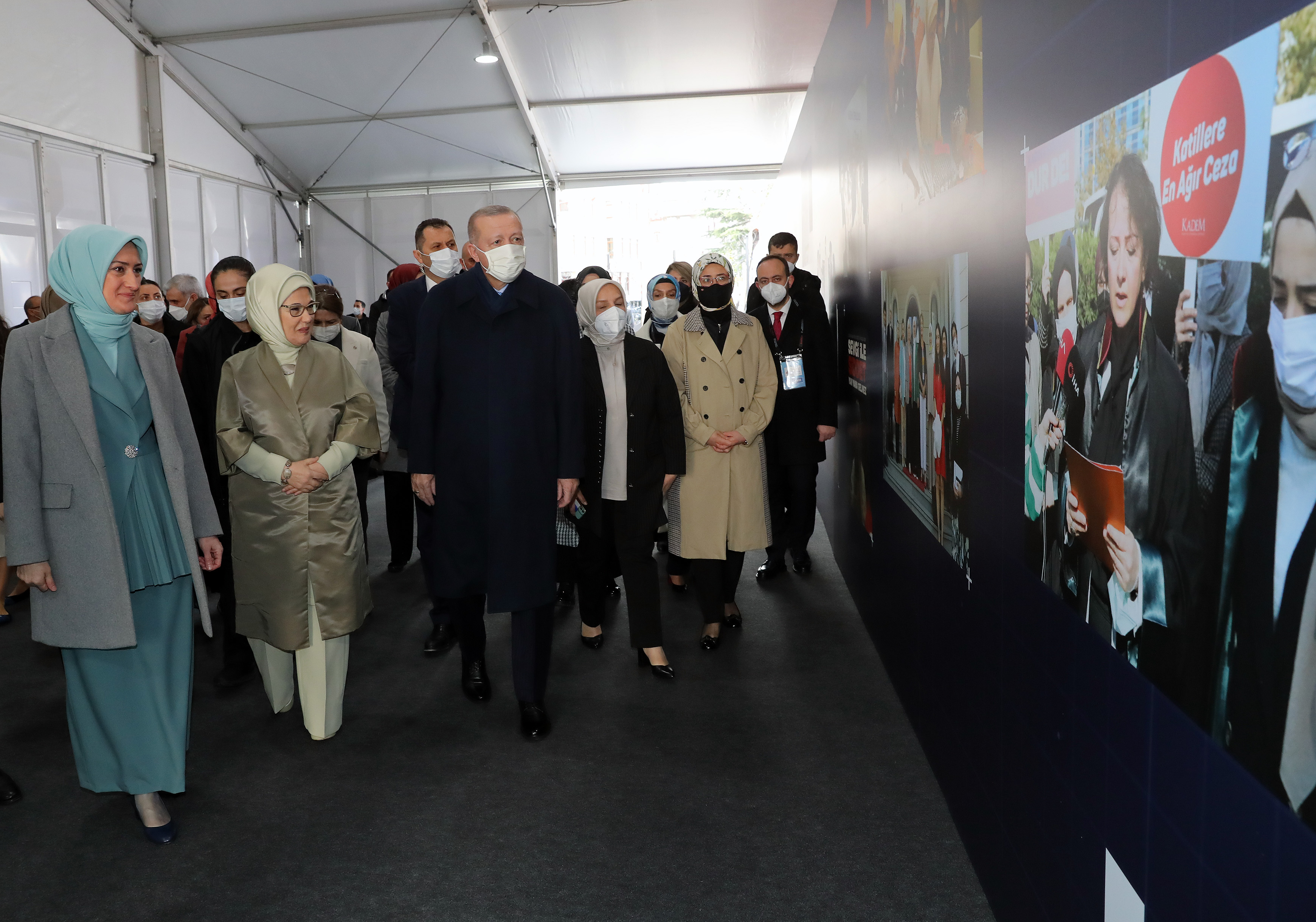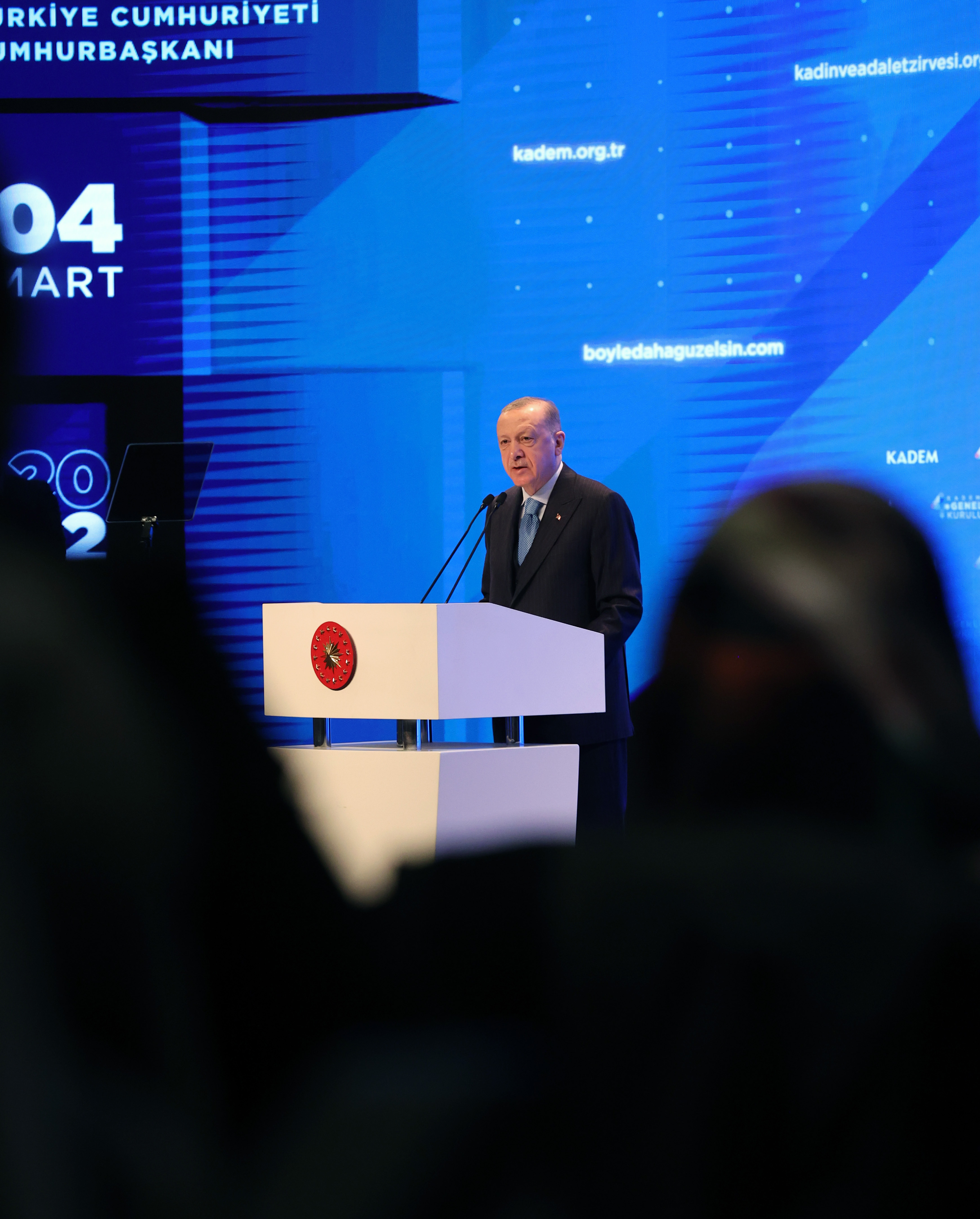 Kadının bireyden aileye, evinden iş hayatına her alandaki hak, adalet ve onur talebine aynı hassasiyetle yaklaştıklarını vurgulayan Cumhurbaşkanı Erdoğan, ülkede kadına yönelik şiddetle mücadelede tarihî bir devrim olan 6284 sayılı kanunun kapsamı ve etkinliğiyle dünyada örnek teşkil eden bir düzenleme olduğuna işaret etti. Cumhurbaşkanı Erdoğan, "Şiddete uğrayan veya uğrama ihtimali bulunan kadınların korunması için konukevleri açılmasından izleme merkezleri kurulmasına, psikolojik ve maddi destekten uzaklaştırma işlemlerine kadar pek çok tedbir hayata geçirilmiştir. Sadece Şiddet Önleme ve İzleme Merkezleri ŞÖNİM'lerden bugüne kadar 1 milyonun üzerinde vatandaşımızın yararlanmış olması, atılan adımların isabetini ve faydasını göstermeye yeterlidir. Kadına sırf cinsiyetinden dolayı uygulanan şiddeti, özellikle öldürme eylemini insan olan hiç kimse kabul etmez, edemez." dedi.