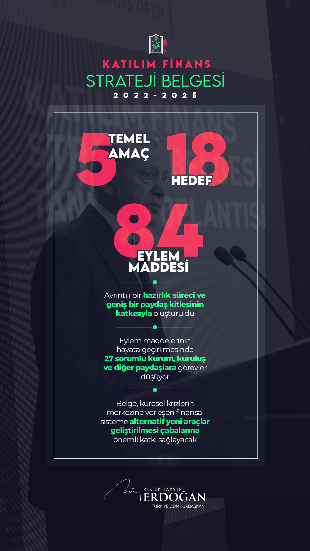 Cumhurbaşkanı Erdoğan paylaşımında, "Bugün tanıtımını gerçekleştirdiğimiz Katılım Finans Strateji Belgesi'nin ülkemize ve milletimize hayırlı olmasını diliyorum. Katılım finansın, finansal sistem içerisinde hak ettiği yere gelmesi için üzerimize düşen sorumlulukları bundan sonra da ifa etmeyi sürdüreceğiz." ifadelerine yer verdi.