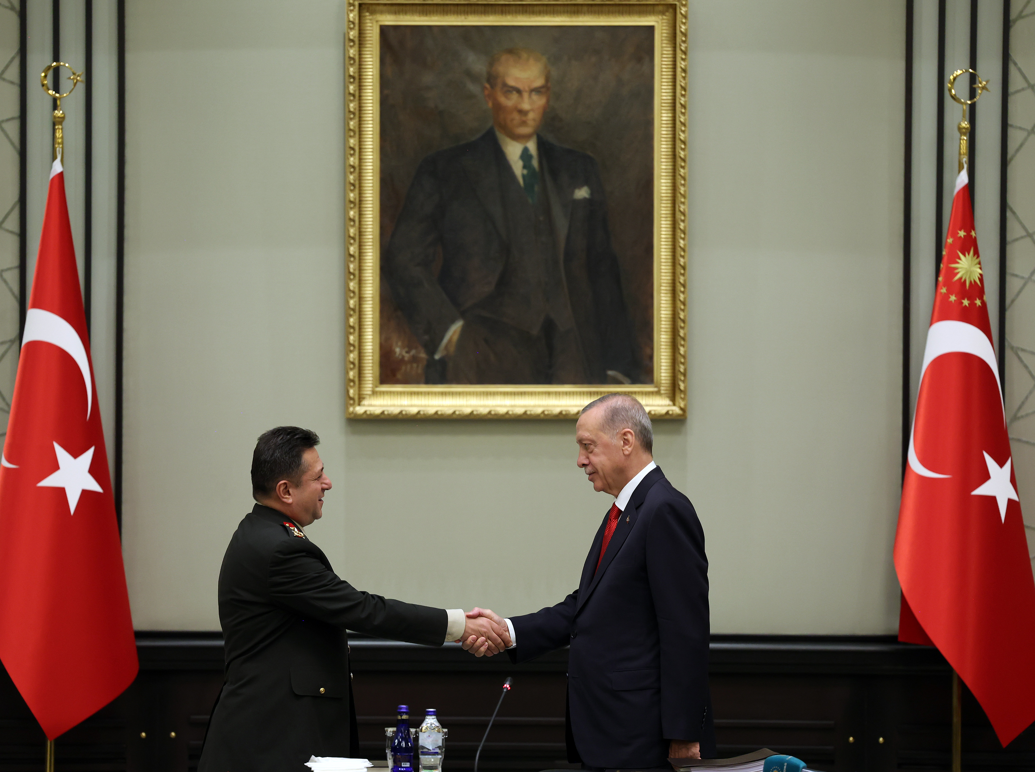 Cumhurbaşkanı Recep Tayyip Erdoğan, Cumhurbaşkanlığı Külliyesi'nde düzenlenen Millî Güvenlik Kurulu (MGK) toplantısına son kez katılan komutanlara hediye takdim etti.