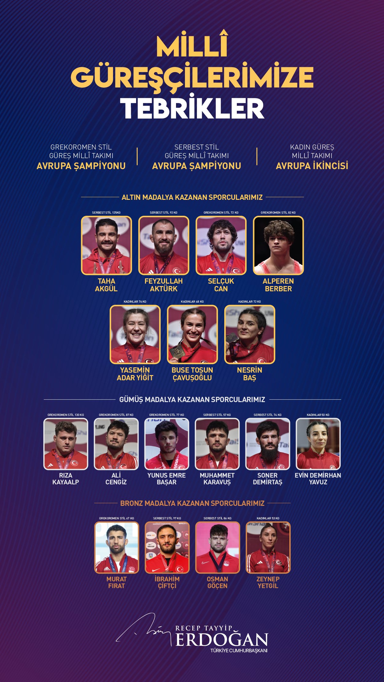 "Avrupa Güreş Şampiyonası'nda hem serbest stil hem de grekoromende Avrupa Şampiyonu olan Erkek Millî Takımımızla birlikte Avrupa İkincisi olan Kadın Millî Takımımızı en kalbî duygularımla tebrik ediyorum. 7 altın, 6 gümüş, 4 bronz olmak üzere toplam 17 madalya kazanarak ülkemize büyük bir gurur yaşatan millî güreşçilerimize gönülden teşekkür ediyorum."