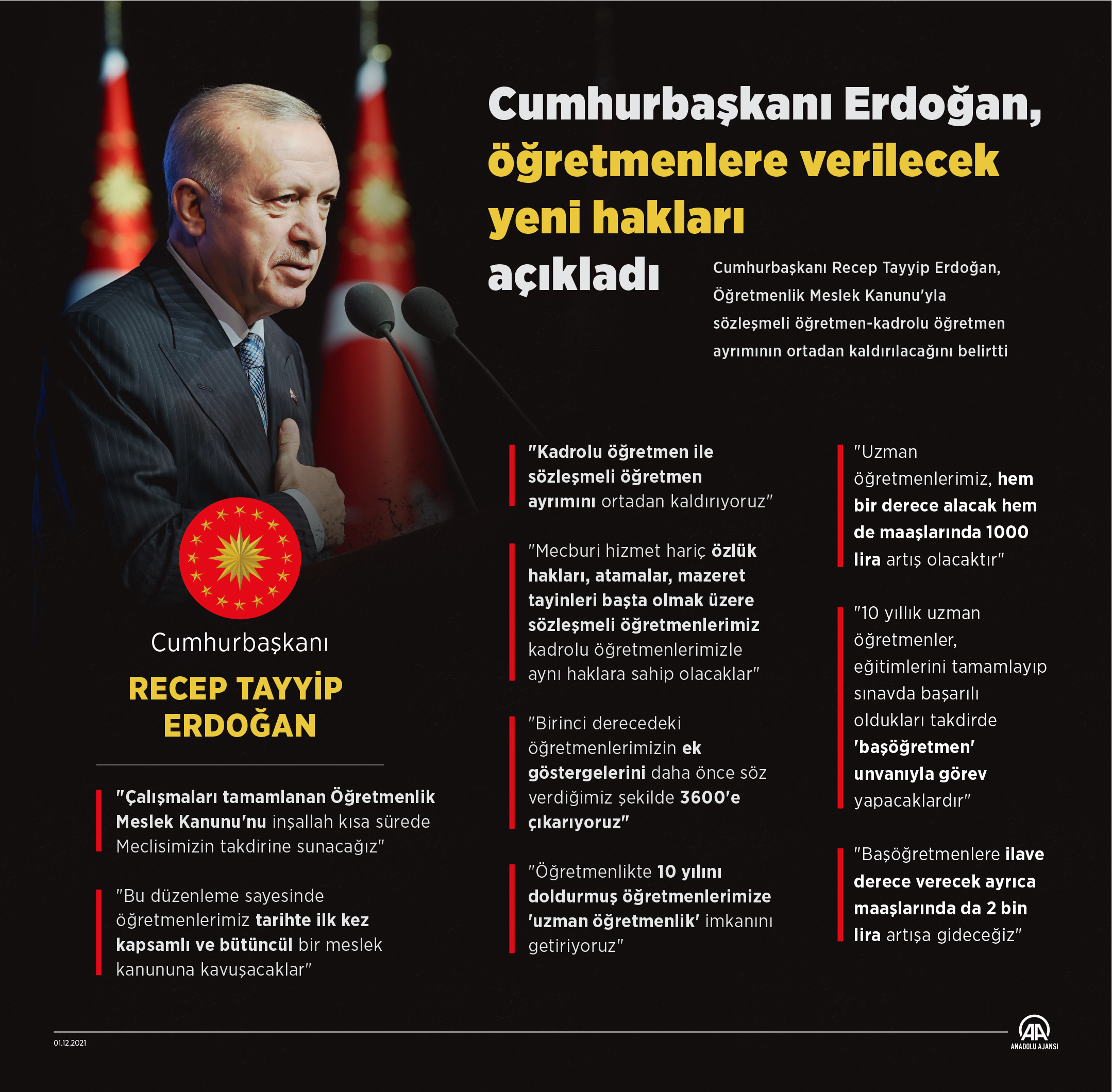 Cumhurbaşkanı Recep Tayyip Erdoğan, öğretmenlerle ilgili geniş kapsamlı bir çalışma yaptıklarını ve uzman öğretmenlik hakkı getireceklerini belirterek, “Sözleşmeli öğretmen ile kadrolu öğretmen ayrımını ortadan kaldırıyoruz. Birinci derecedeki öğretmenlerimizin ek göstergelerini daha önce söz verdiğimiz şekilde 3600'e çıkarıyoruz.” dedi.