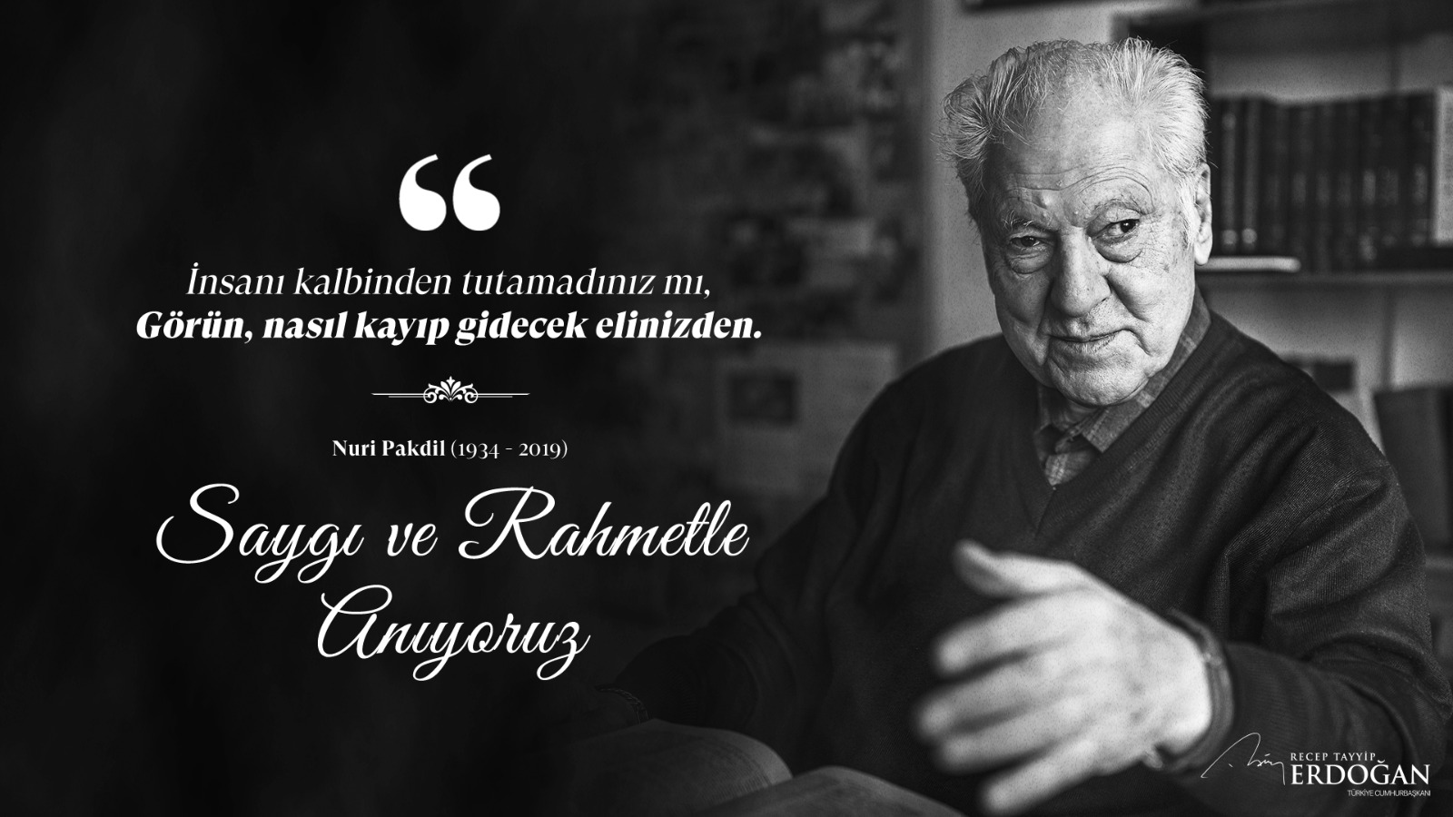 Cumhurbaşkanı Erdoğan, paylaşımında Pakdil'in fotoğrafı ve "İnsanı kalbinden tutamadınız mı, görün nasıl kayıp gidecek elinizden." sözünün yer aldığı bir de görsele yer verdi.