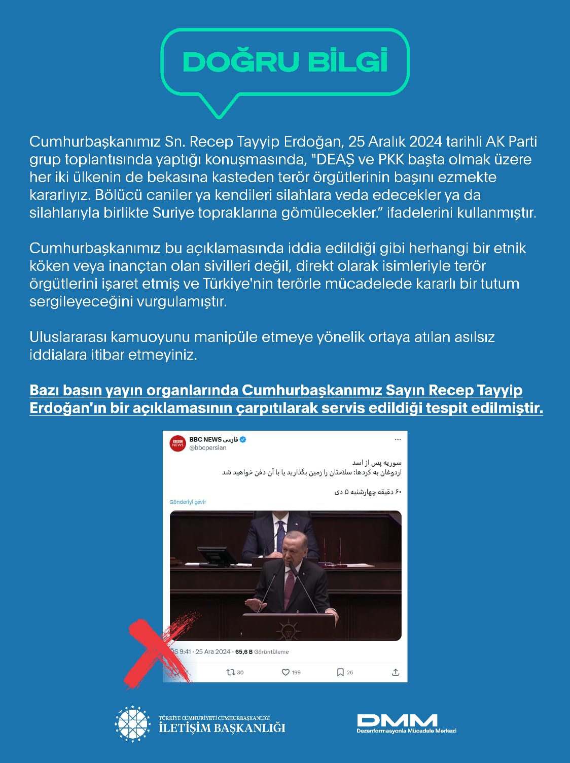 Cumhurbaşkanı Erdoğan, 25 Aralık 2024 tarihli AK Parti grup toplantısında yaptığı konuşmasında, "DEAŞ ve PKK başta olmak üzere her iki ülkenin de bekasına kasteden terör örgütlerinin başını ezmekte kararlıyız. Bölücü caniler ya kendileri silahlara veda edecekler ya da silahlarıyla birlikte Suriye topraklarına gömülecekler.” ifadelerini kullanmıştır.
