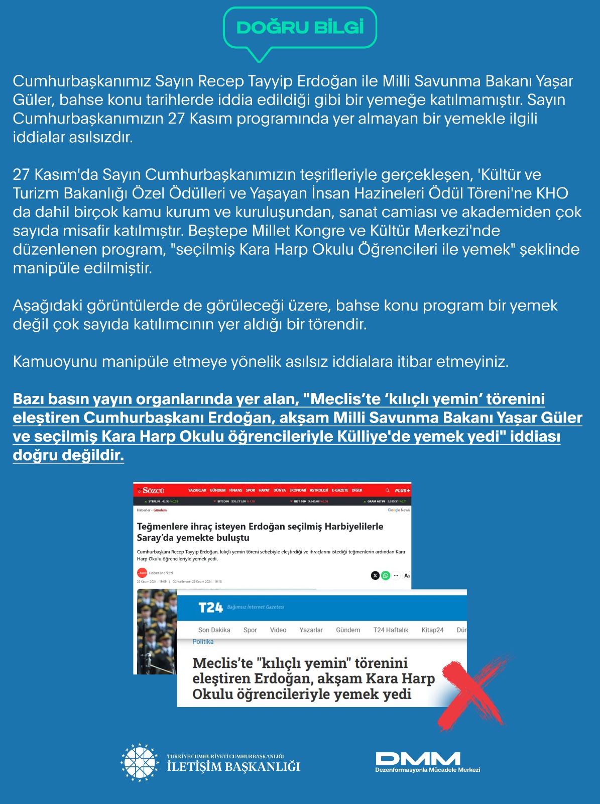 Bazı basın yayın organlarında yer alan "Meclis’te ‘kılıçlı yemin’ törenini eleştiren Cumhurbaşkanı Erdoğan, akşam Millî Savunma Bakanı Yaşar Güler ve seçilmiş Kara Harp Okulu öğrencileriyle Külliye'de yemek yedi" iddiası doğru değildir.