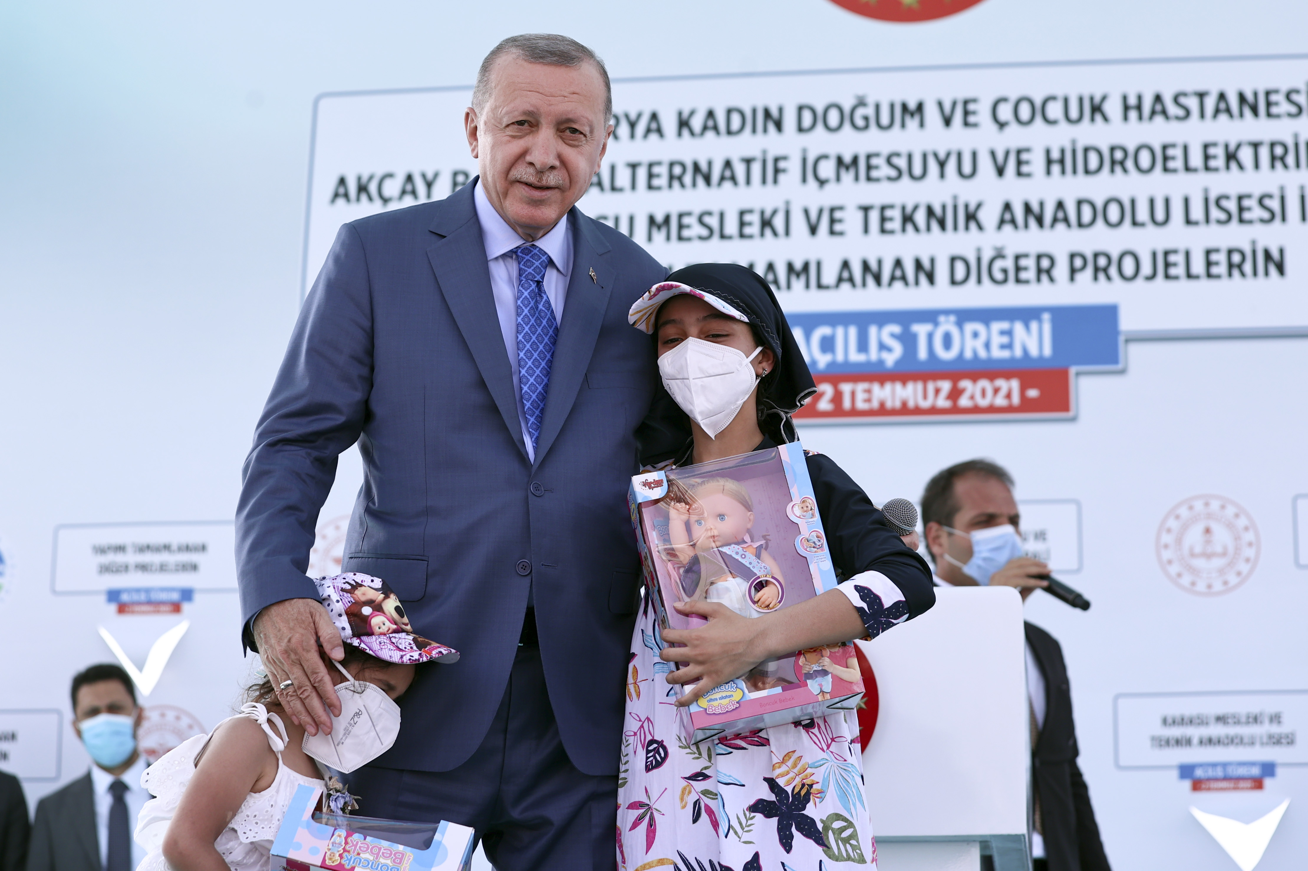 Cumhurbaşkanı Erdoğan daha sonra katılımcılarla birlikte yapımı tamamlanan projelerin açılış kurdelesini kesti. Platforma alandaki çocukları da davet eden Cumhurbaşkanı Erdoğan, açılışta kullanılan makası ve kesilen kurdele parçalarını günün hatırası olarak katılımcılara hediye etti.