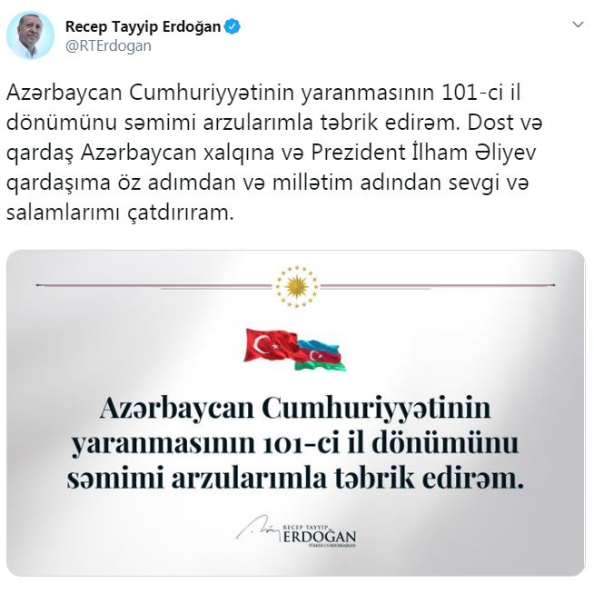 Cumhurbaşkanı Recep Tayyip Erdoğan, Azerbaycan Cumhuriyeti'nin kuruluşunun 101. yılını Twitter hesabından tebrik etti.