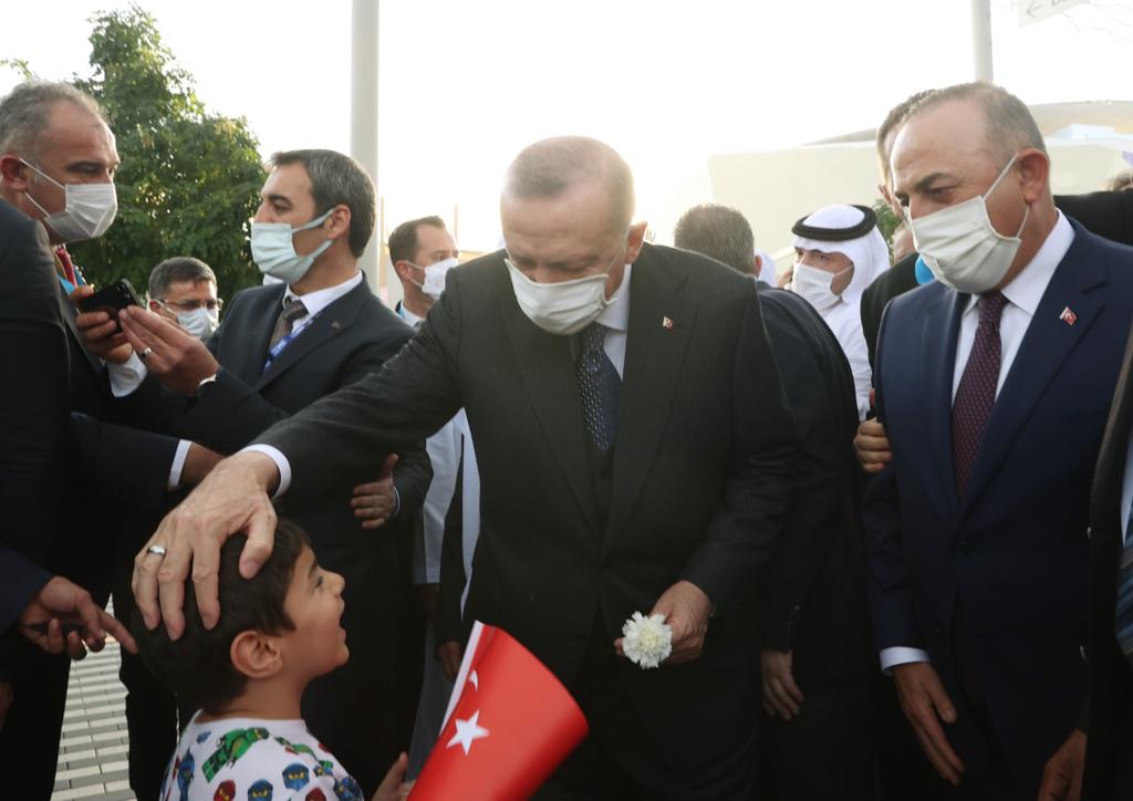 Cumhurbaşkanı Erdoğan, Al Wasl Plaza'daki bayrak töreninin ardından "buggy" olarak adlandırılan golf aracı ile Türkiye'nin sergi alanına hareket etti.