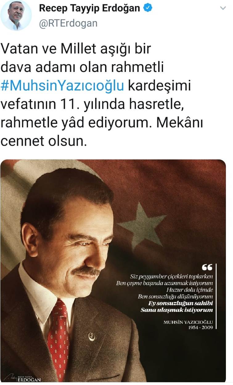 Cumhurbaşkanı Erdoğan, sosyal medya hesabından yaptığı paylaşımda, "Vatan ve millet aşığı bir dava adamı olan rahmetli #MuhsinYazıcıoğlu kardeşimi vefatının 11. yılında hasretle, rahmetle yad ediyorum. Mekanı cennet olsun." ifadelerini kullandı.