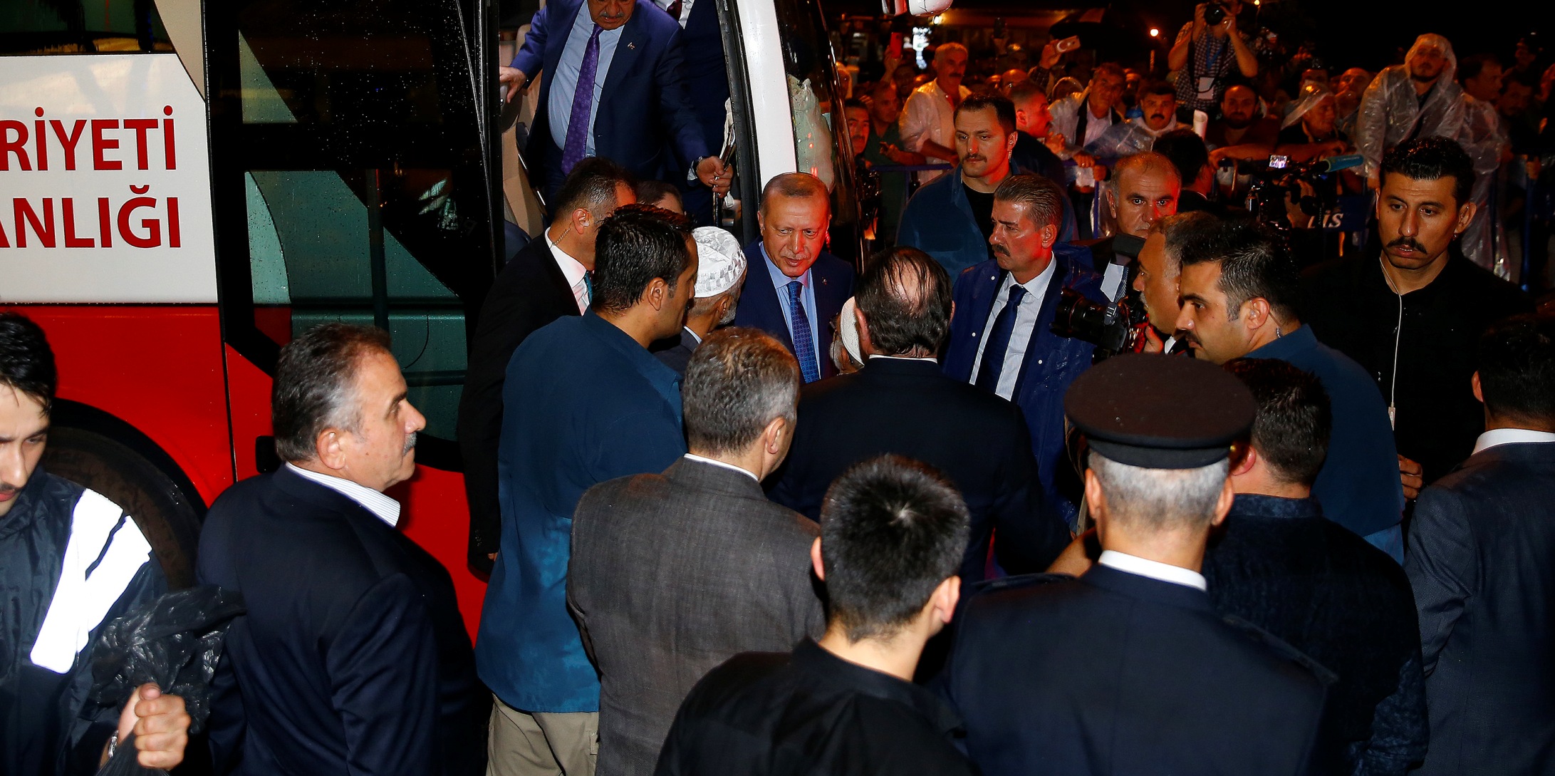 Memleketi Güneysu'ya gelen Cumhurbaşkanı Recep Tayyip Erdoğan, Merkez Camisi önünde kendisini bekleyen vatandaşları selamladı. Makam aracından inerek otobüse geçen Cumhurbaşkanı Erdoğan, burada kısa bir konuşma yaptı.