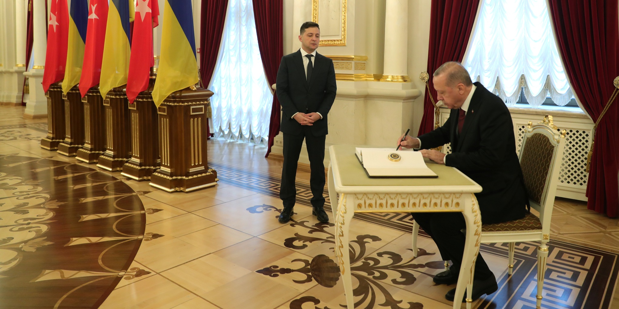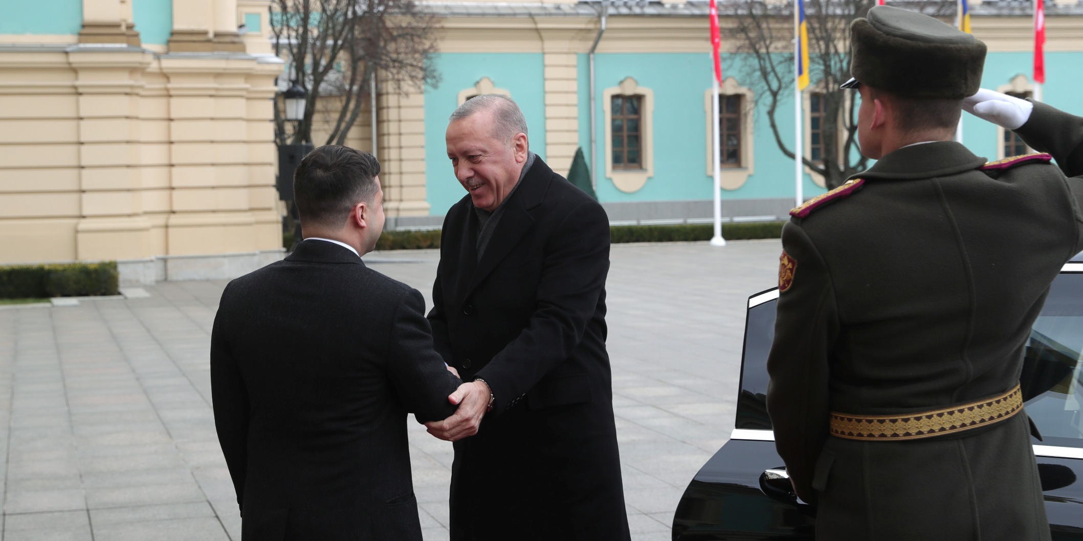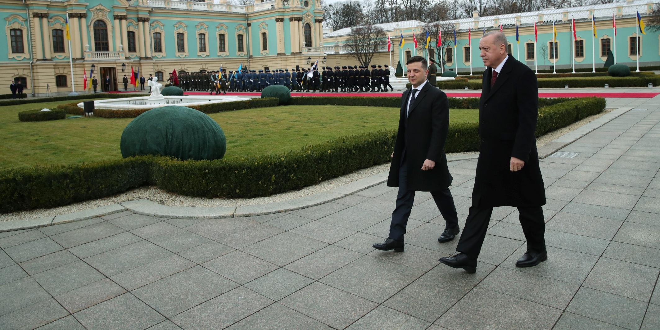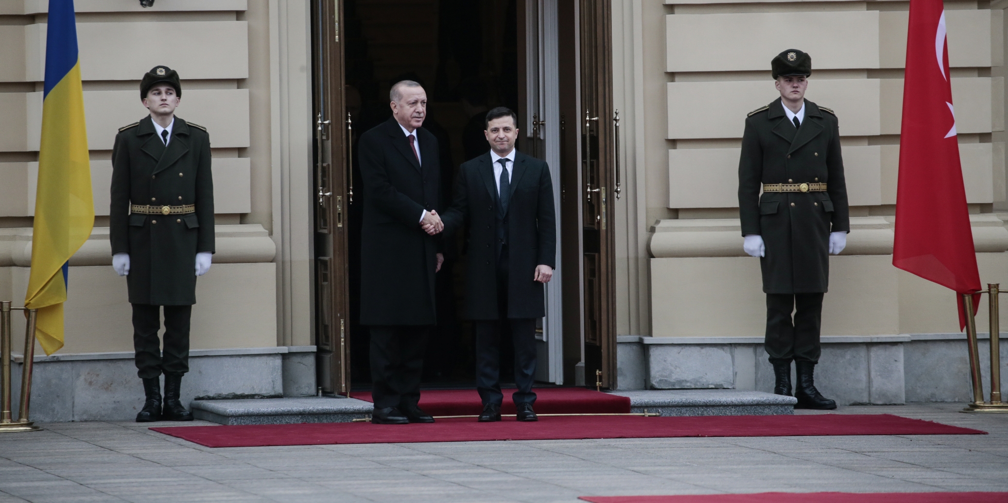Cumhurbaşkanı Erdoğan, Saray'a gelişinde Zelenskiy tarafından karşılandı. Erdoğan ve Zelenskiy'nin tören alanındaki yerlerini almalarının ardından Türkiye ve Ukrayna milli marşları çalındı. İki lider tören kıtasını denetledi ve Erdoğan, tören kıtasını "Slava Ukraine (Yaşasın Ukrayna)" diyerek selamladı.