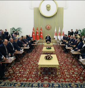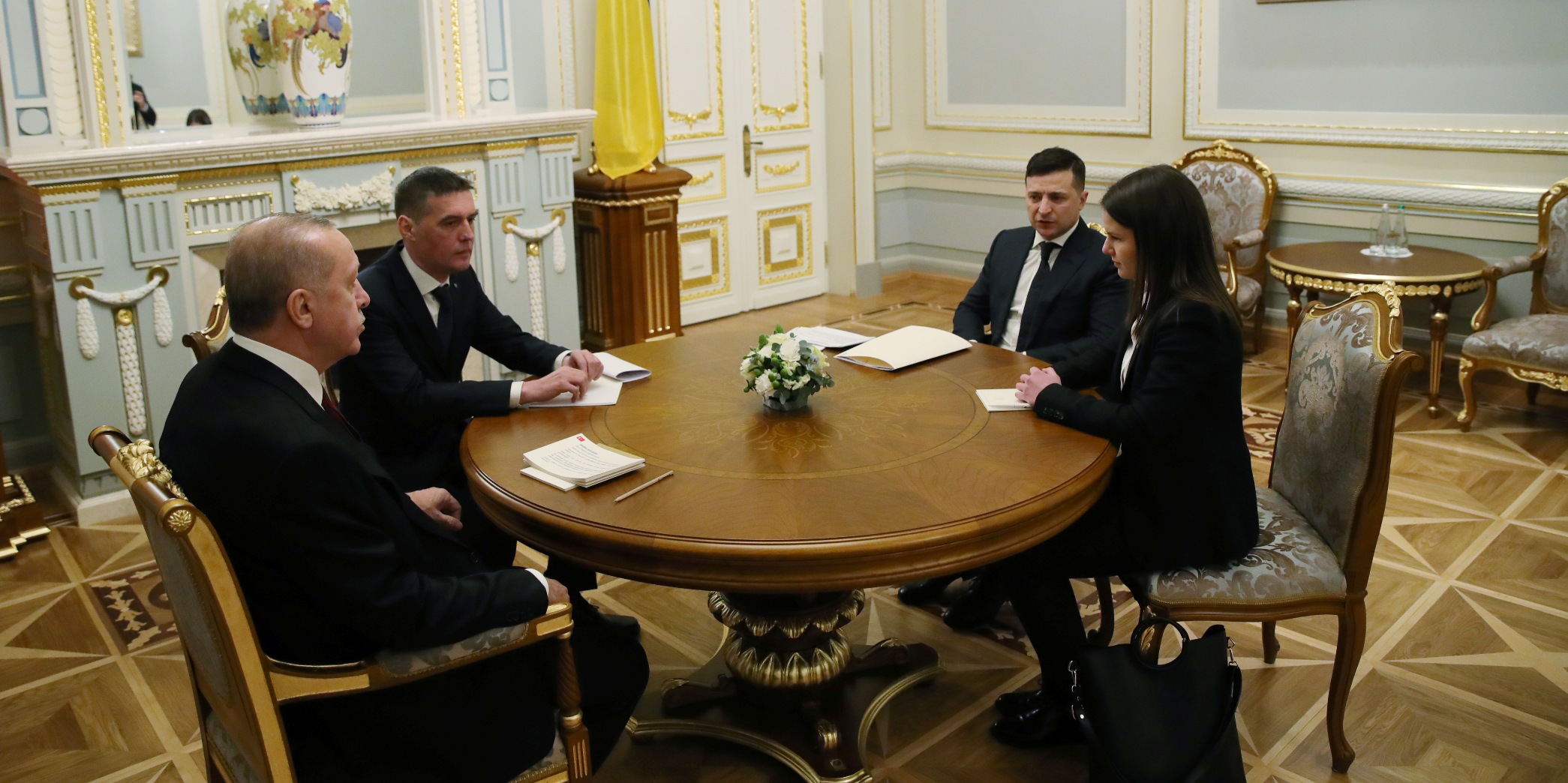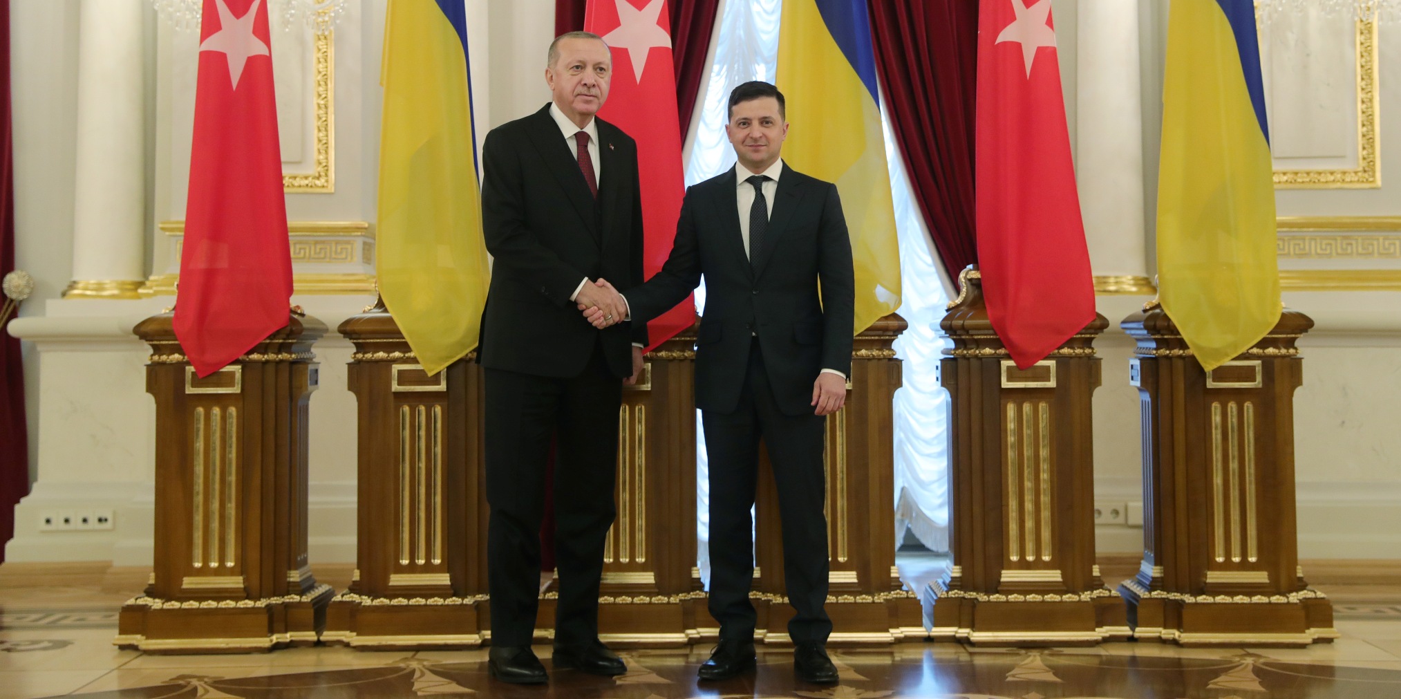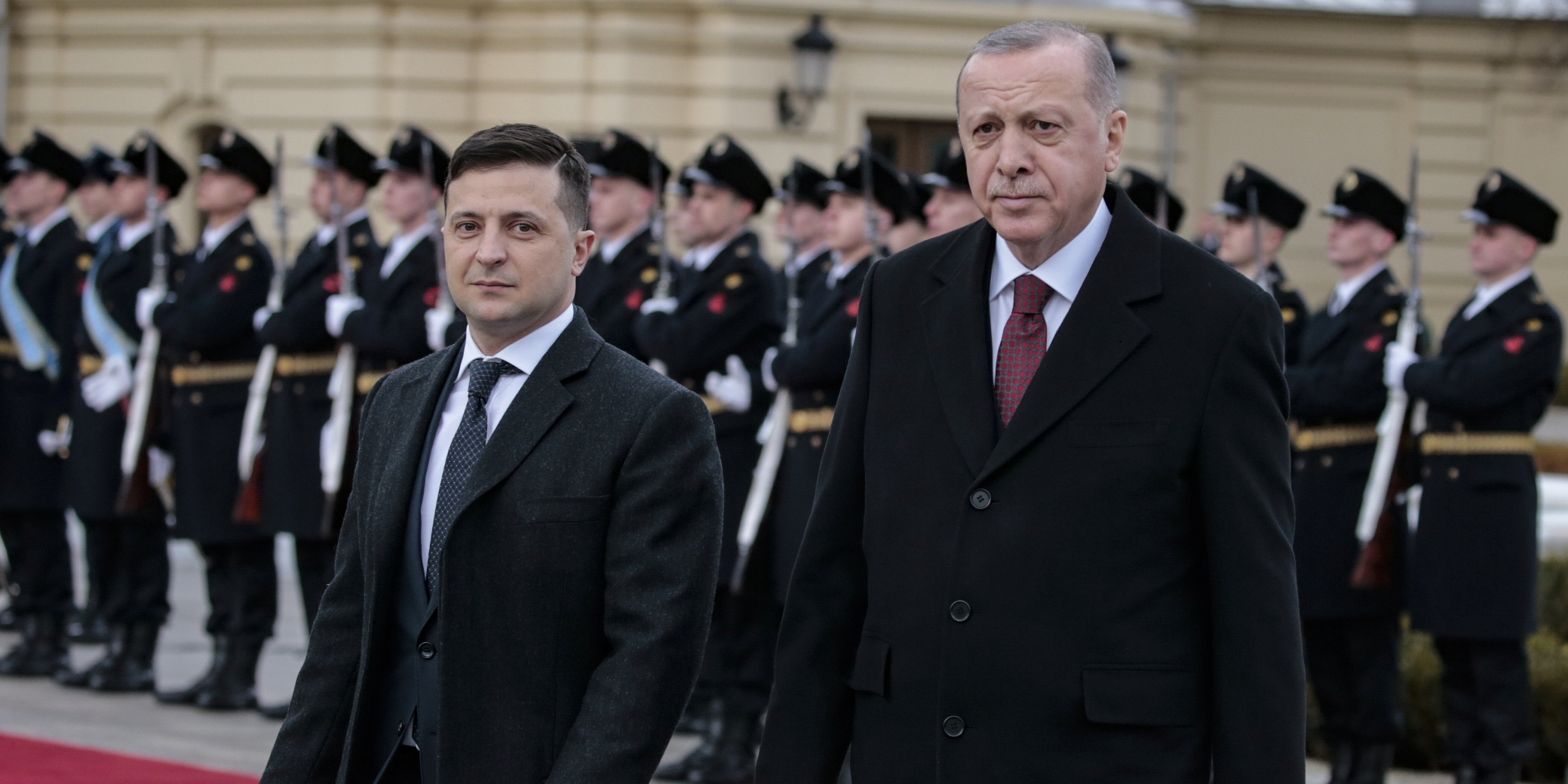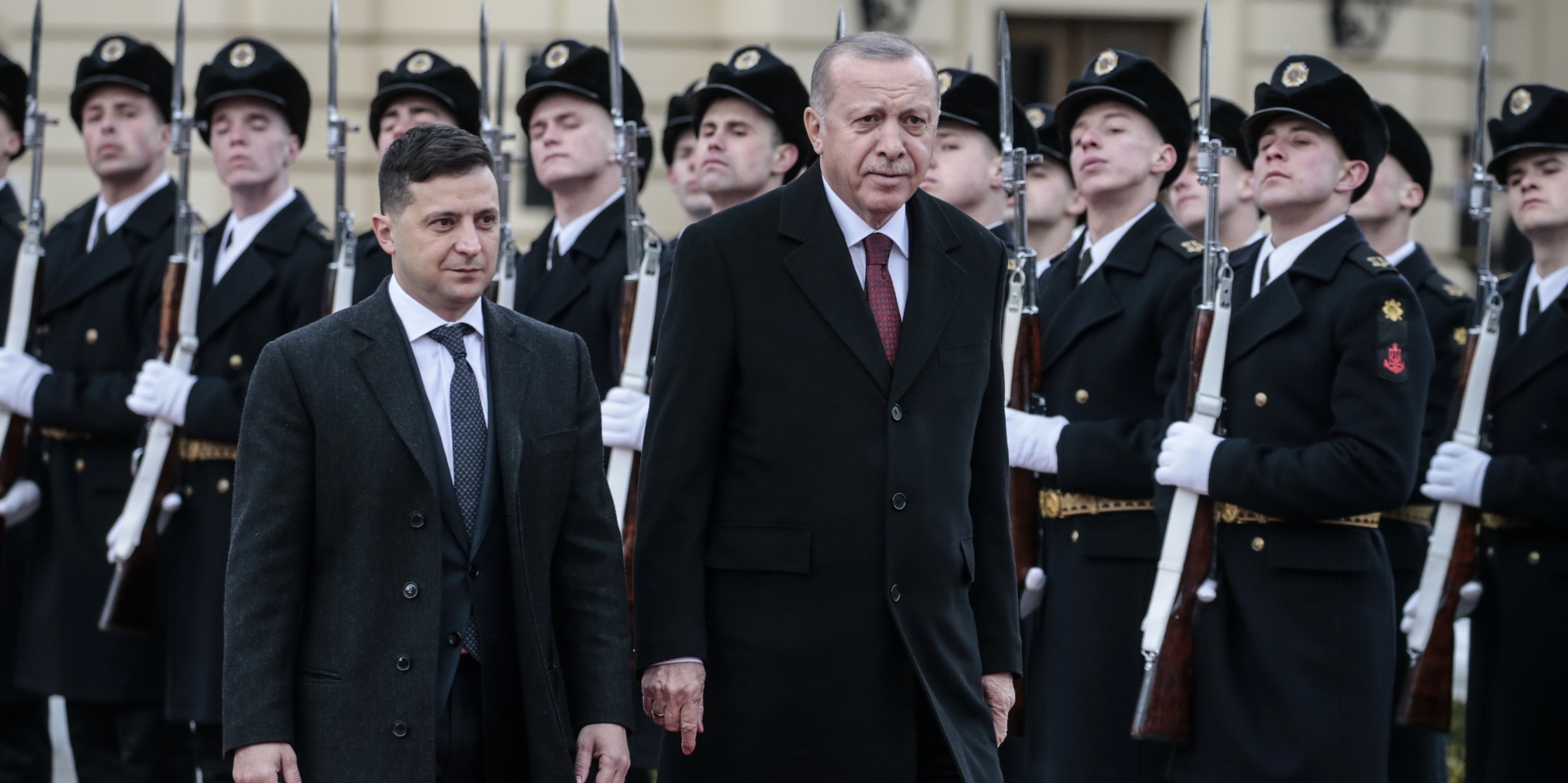 Cumhurbaşkanı Erdoğan, Saray'a gelişinde Zelenskiy tarafından karşılandı. Erdoğan ve Zelenskiy'nin tören alanındaki yerlerini almalarının ardından Türkiye ve Ukrayna milli marşları çalındı. İki lider tören kıtasını denetledi ve Erdoğan, tören kıtasını "Slava Ukraine (Yaşasın Ukrayna)" diyerek selamladı.