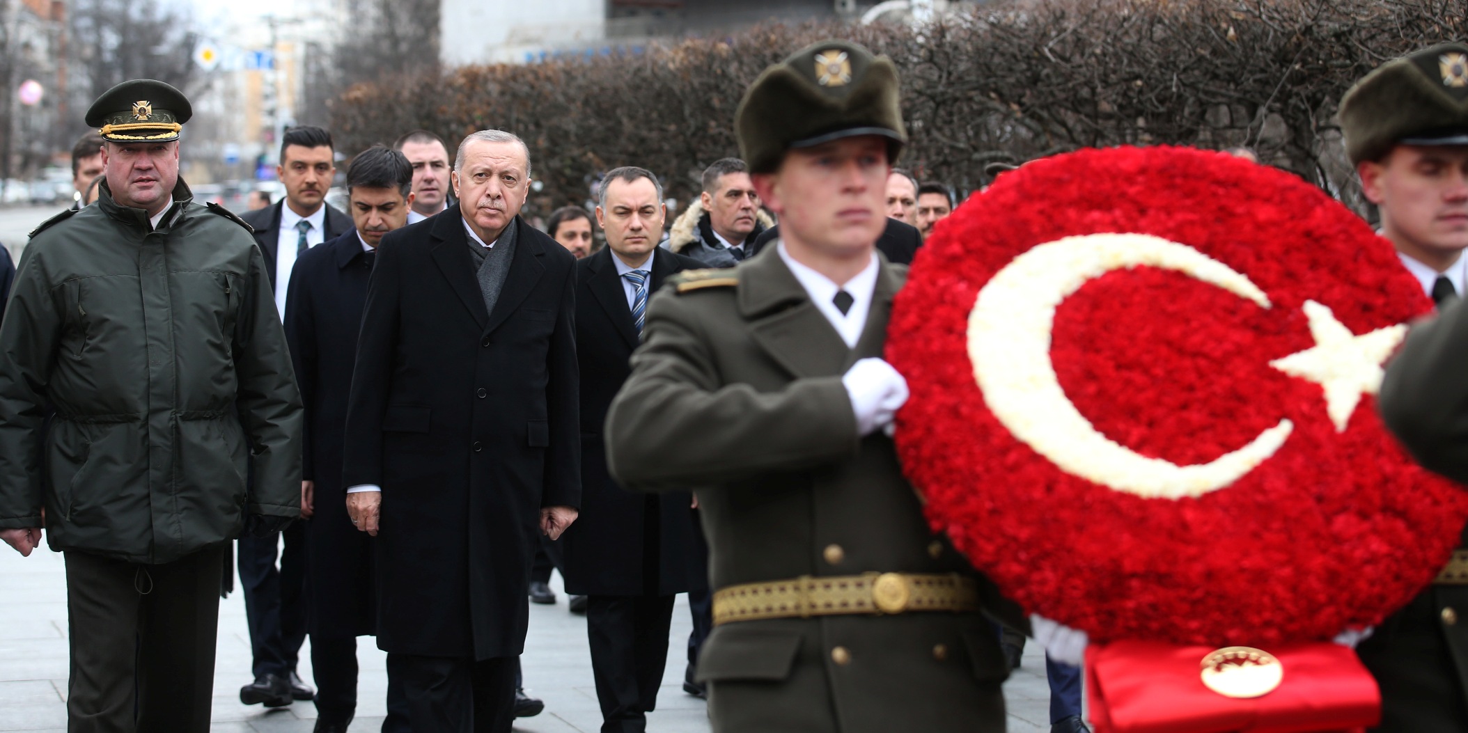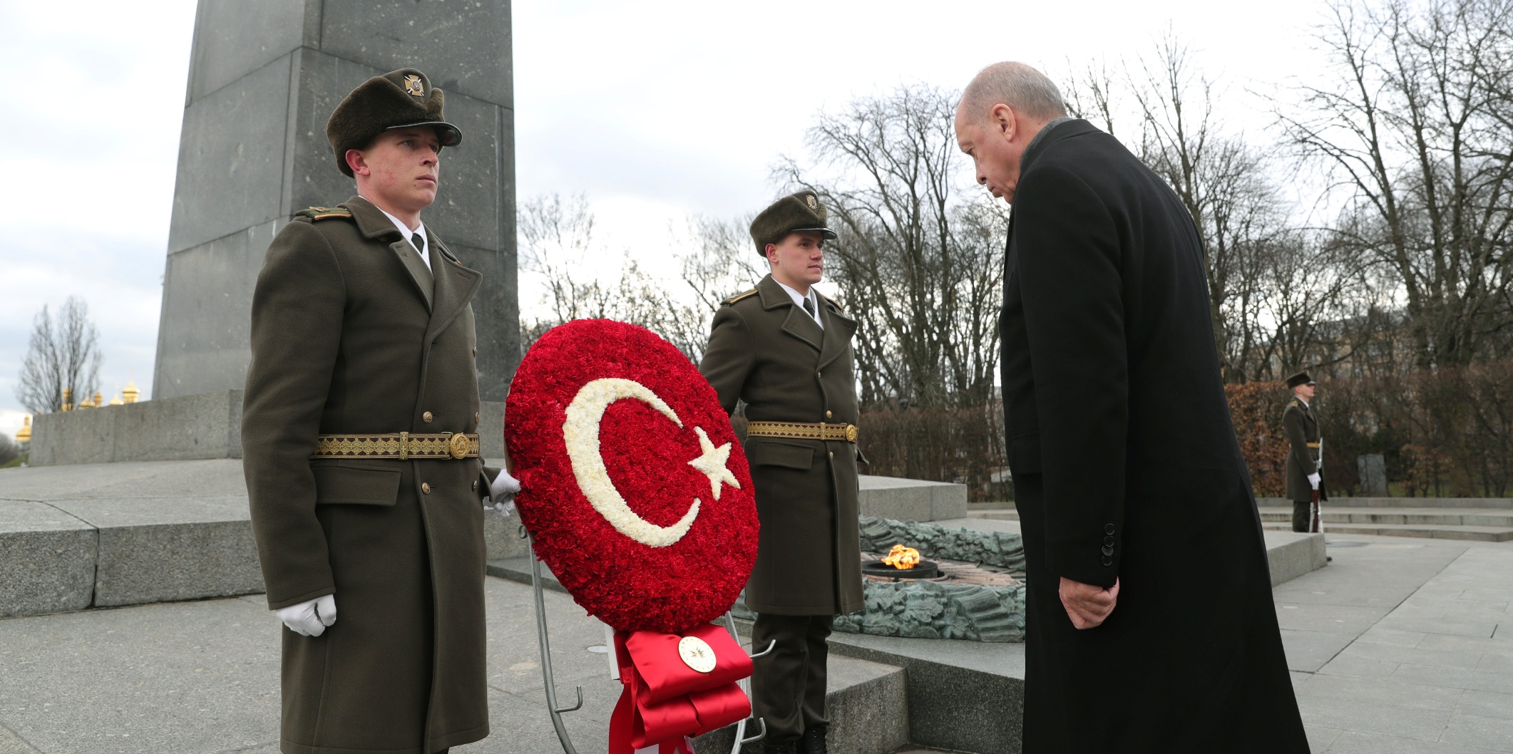 Cumhurbaşkanı Erdoğan, resmî ziyarette bulunmak üzere geldiği Kiev'de ilk olarak Meçhul Asker Anıtı'nı ziyaret etti. Burada anıta çelenk bırakan Erdoğan, daha sonra Marinskiy Sarayı'na geçti.