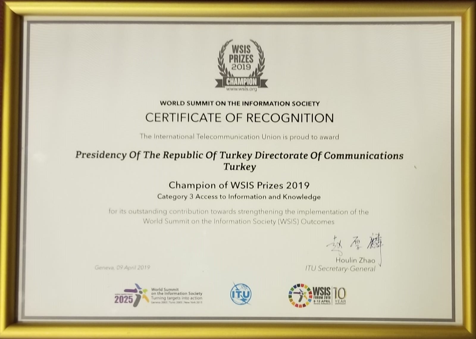 Cumhurbaşkanlığı İletişim Başkanlığı, 18 kategoride toplam 1.064 adayın katılımıyla gerçekleştirilen ve 2 milyondan fazla oyun kullanıldığı yarışmada CİMER ile “Bilgiye Erişim” kategorisinde en çok oyu alan 5 proje arasına girerek ‘’WSIS Prize 2019 Champion” ödülünün sahibi oldu.