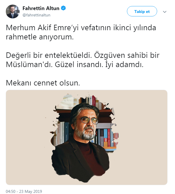 Cumhurbaşkanlığı İletişim Başkanı Prof. Dr. Fahrettin Altun, merhum gazeteci-yazar Akif Emre’nin vefatının ikinci yılı nedeniyle Twitter üzerinden bir paylaşımda bulundu.
