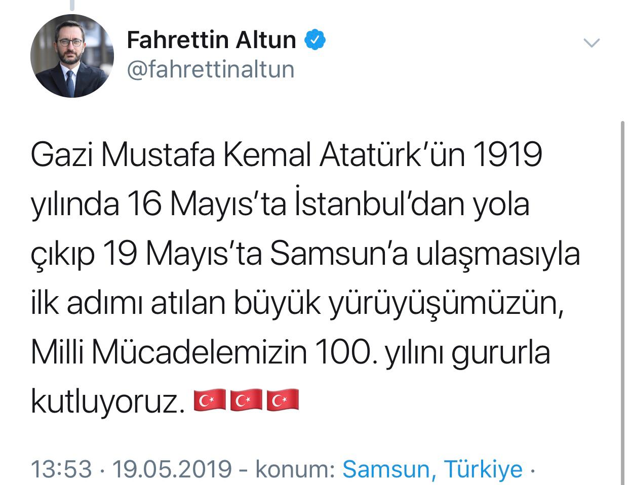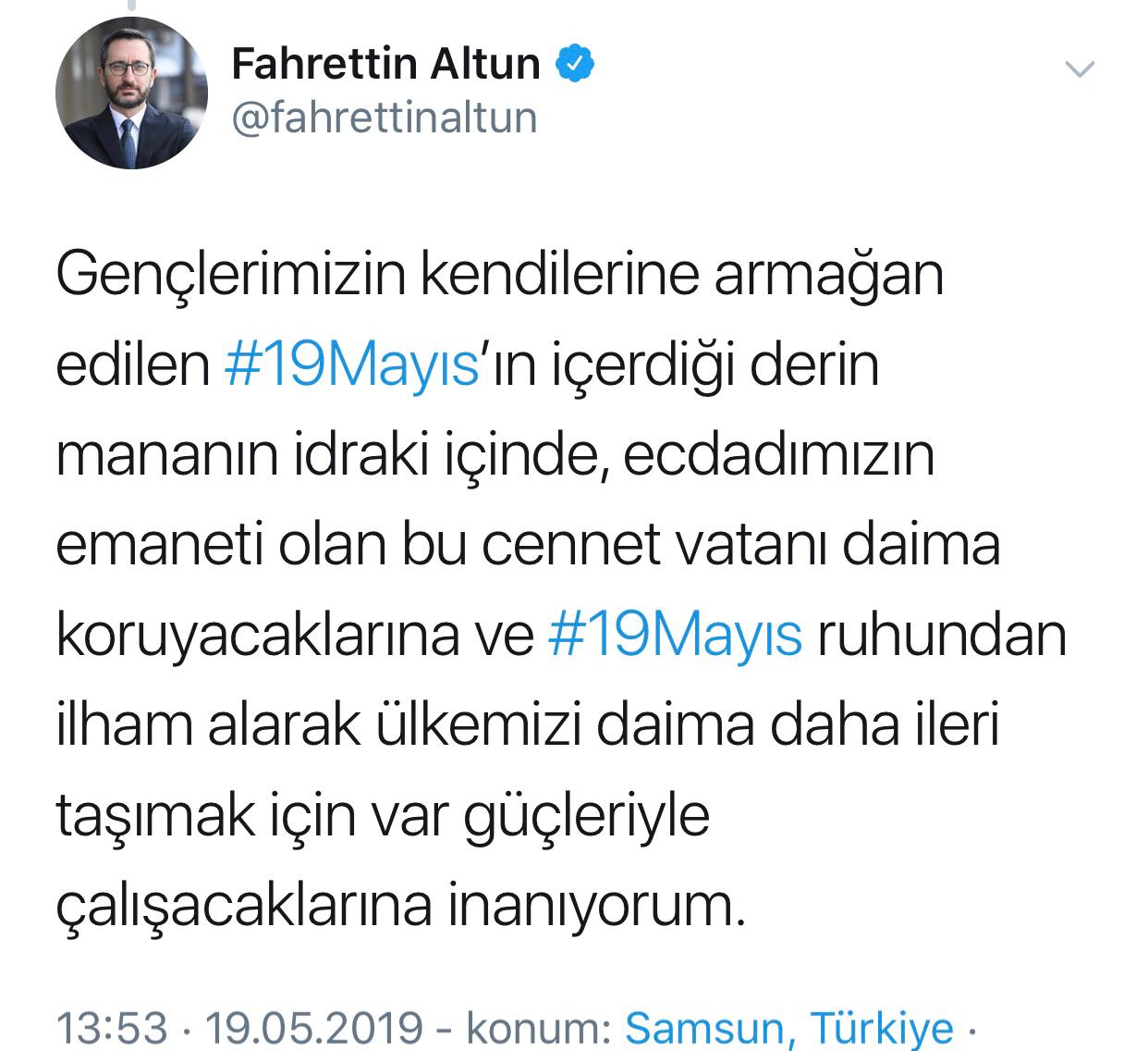Cumhurbaşkanlığı İletişim Başkanı Prof. Dr. Fahrettin Altun, Twitter hesabından 19 Mayıs Atatürk'ü Anma, Gençlik ve Spor Bayramı dolayısıyla yaptığı paylaşımda, "19 Mayıs 1919 Hakk'ın ve milletin desteğinden başka hiçbir şeye güvenmeden göğsünü düşmana siper edenlerin, cesaret ve inançla tarihin akışını değiştirenlerin günüdür." ifadelerine yer verdi.