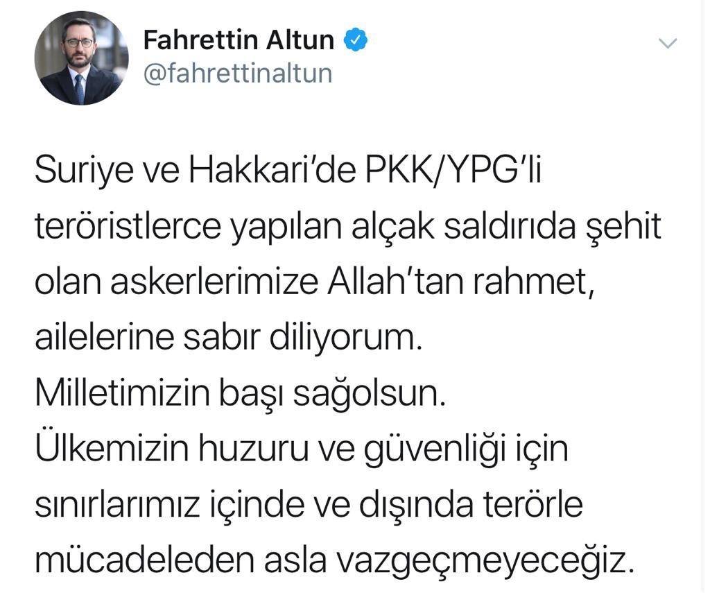Cumhurbaşkanlığı İletişim Başkanı Prof. Dr. Fahrettin Altun, Twitter hesabından, Hakkari ve Suriye'deki terör saldırıları sonucu şehit olan askerlere Allah'tan rahmet, yaralılara acil şifalar diledi.