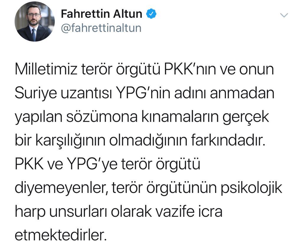 "Milletimiz terör örgütü PKK'nın ve onun Suriye uzantısı YPG'nin adını anmadan yapılan sözüm ona kınamaların gerçek bir karşılığının olmadığının farkındadır. PKK ve YPG'ye terör örgütü diyemeyenler, terör örgütünün psikolojik harp unsurları olarak vazife icra etmektedirler."
