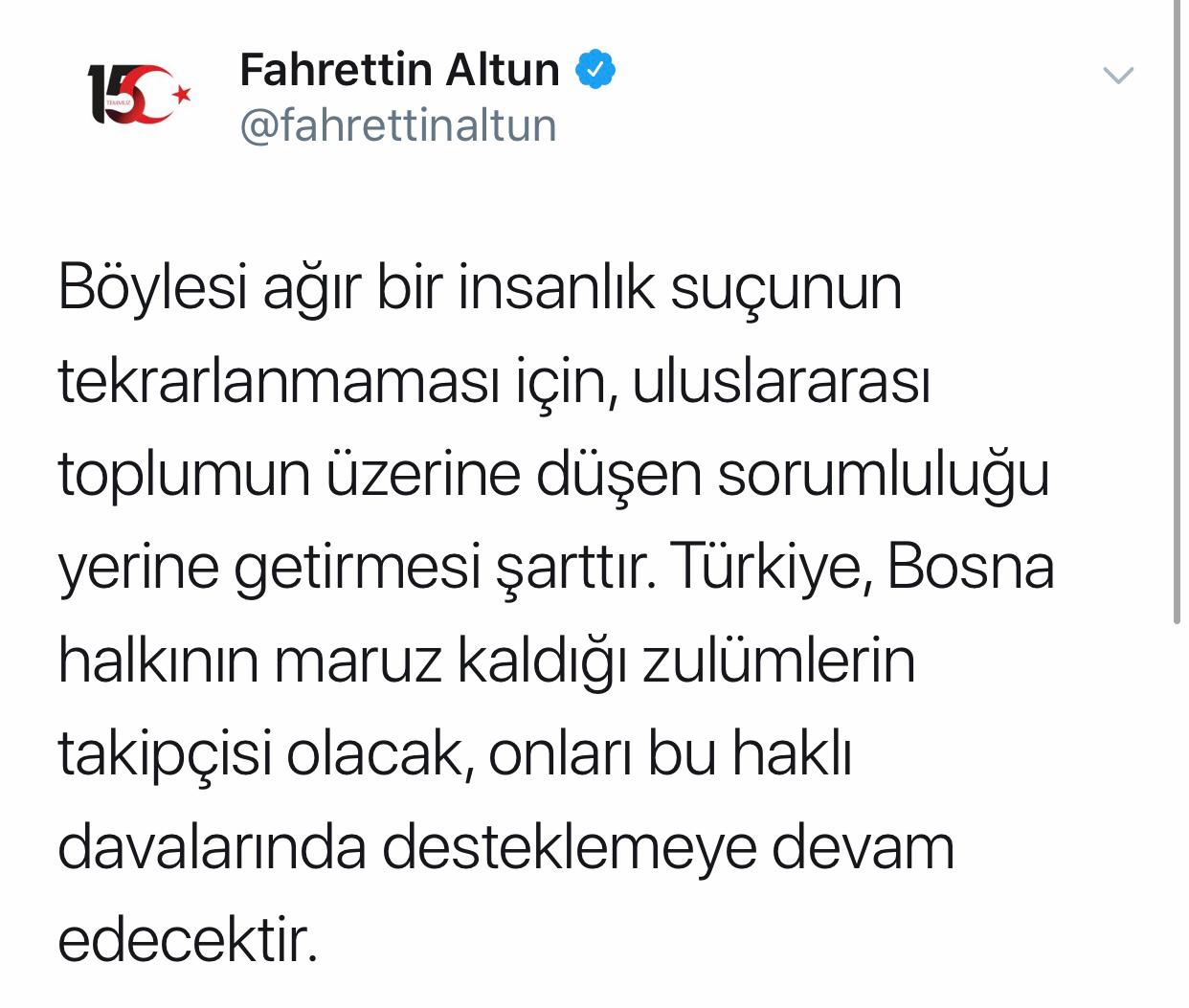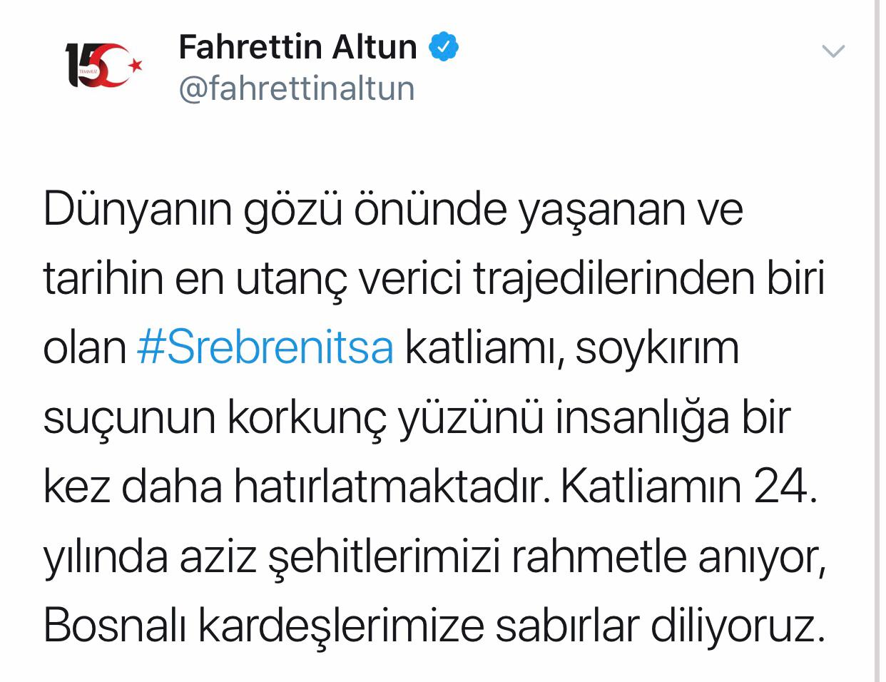 Altun, Bosna Hersek'in doğusundaki Srebrenitsa'da 1995'te yaşanan soykırımın 24. yılı dolayısıyla Twitter hesabından paylaşımda bulundu. Fahrettin Altun, paylaşımında şunları kaydetti: