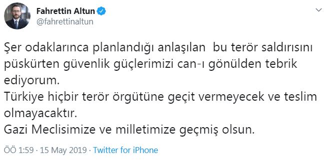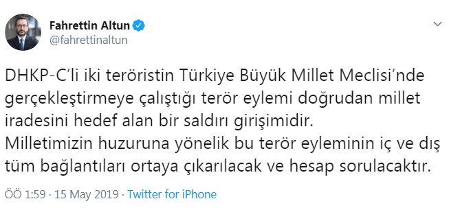Fahrettin Altun, "DHKP-C’li iki teröristin TBMM'de gerçekleştirmeye çalıştığı terör eylemi doğrudan millet iradesini hedef alan bir saldırı girişimidir." ifadelerini kullandı.