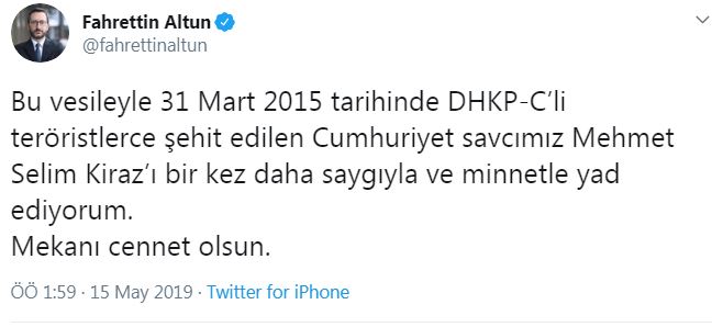 Bu vesileyle 31 Mart 2015 tarihinde DHKP-C'li teröristlerce şehit edilen Cumhuriyet Savcımız Mehmet Selim Kiraz'ı bir kez daha saygıyla ve minnetle yad ediyorum. Mekanı cennet olsun."