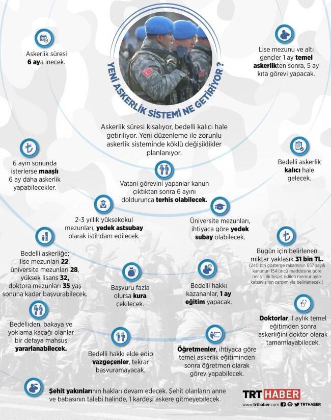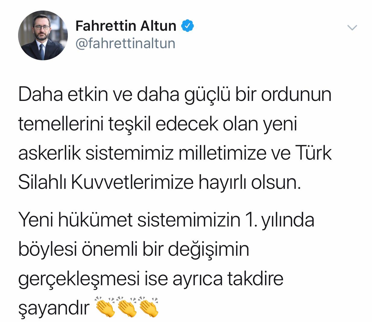 "Daha etkin ve daha güçlü bir ordunun temellerini teşkil edecek olan yeni askerlik sistemimiz milletimize ve Türk Silahlı Kuvvetlerimize hayırlı olsun. Yeni hükümet sistemimizin 1. yılında böylesi önemli bir değişimin gerçekleşmesi ise ayrıca takdire şayandır."