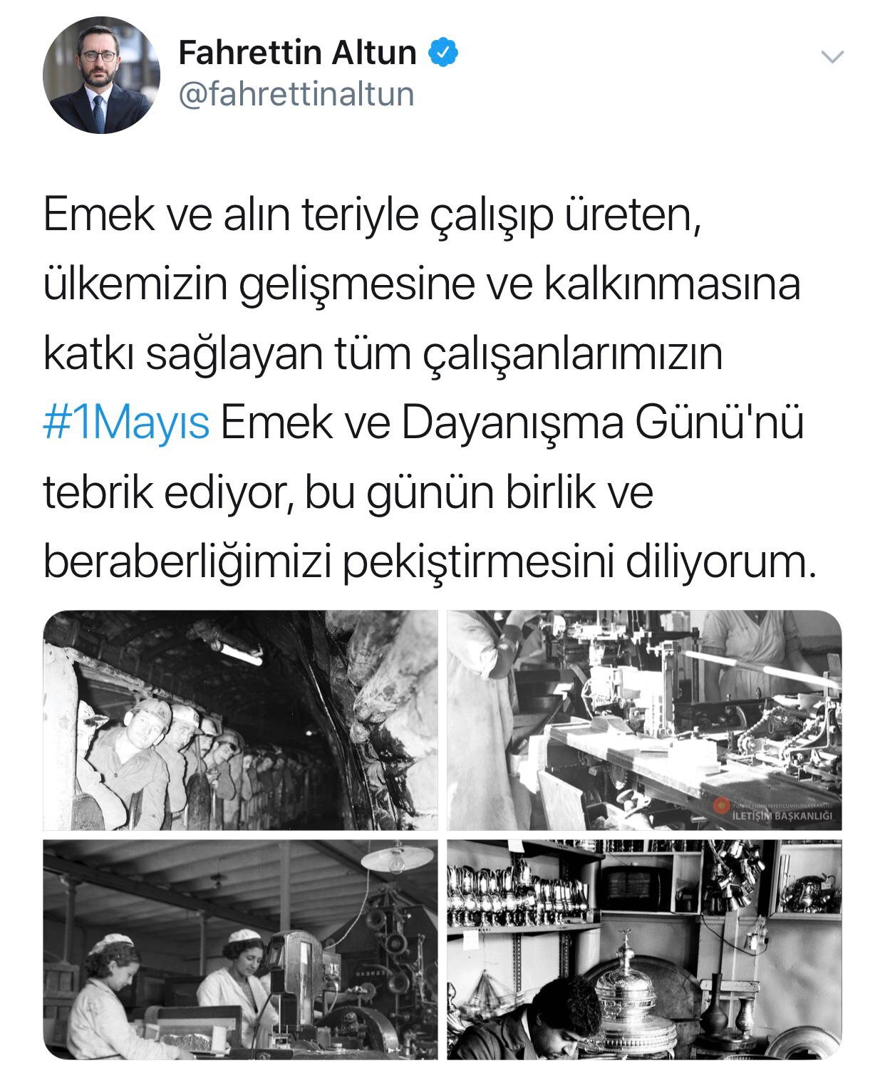 Cumhurbaşkanlığı İletişim Başkanı Prof. Dr. Fahrettin Altun, 1 Mayıs Emek ve Dayanışma Günü münasebetiyle, Twitter üzerinden paylaşım yaptı.