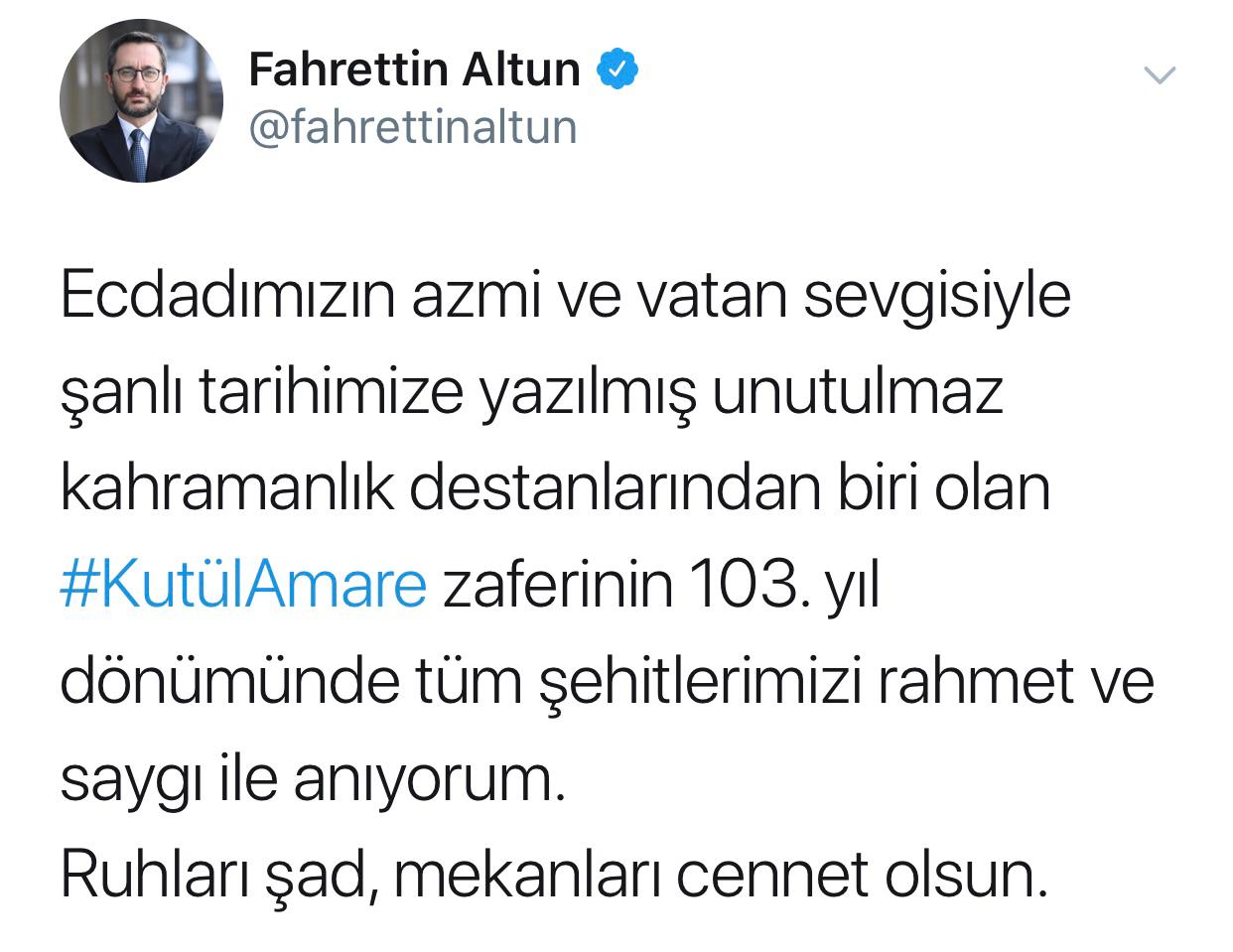 Cumhurbaşkanlığı İletişim Başkanı Prof. Dr. Fahrettin Altun, Kut’ül Amare Zaferi’nin 103. yıl dönümü münasebetiyle, Twitter hesabı üzerinden paylaşım yaptı.
