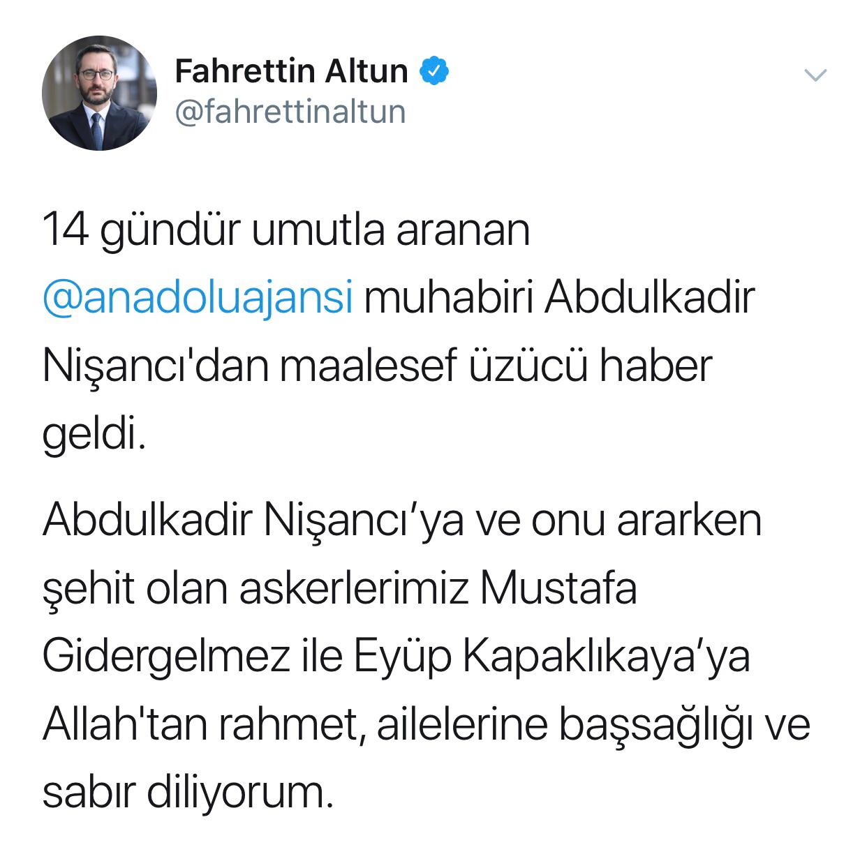 Paylaşımında, günlerdir umutla aranan Anadolu Ajansı muhabiri Abdulkadir Nişancı'dan üzücü haber geldiğini belirten Altun, "Abdulkadir Nişancı'ya ve onu ararken şehit olan askerlerimiz Mustafa Gidergelmez ile Eyüp Kapaklıkaya'ya Allah'tan rahmet, ailelerine başsağlığı ve sabır diliyorum." ifadelerini kullandı.
