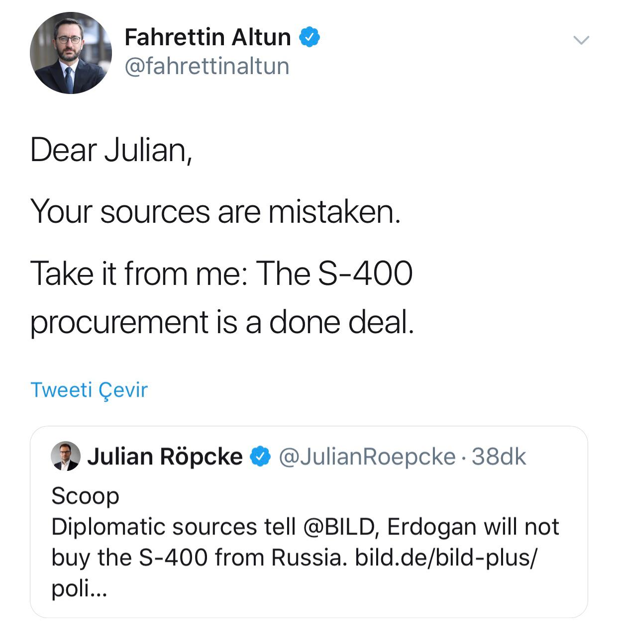 Cumhurbaşkanlığı İletişim Başkanı Prof. Dr. Fahrettin Altun, Alman Bild gazetesinin dış politika editörü Julian Röpcke'nin, Türkiye'nin Rusya'dan S-400 satın almayacağı yönündeki ifadelerine, "Sevgili Julian, kaynaklarınız hatalı. Bilgiyi benden alın: S-400 satın alma işlemi tamamlandı." şeklinde yanıt verdi.